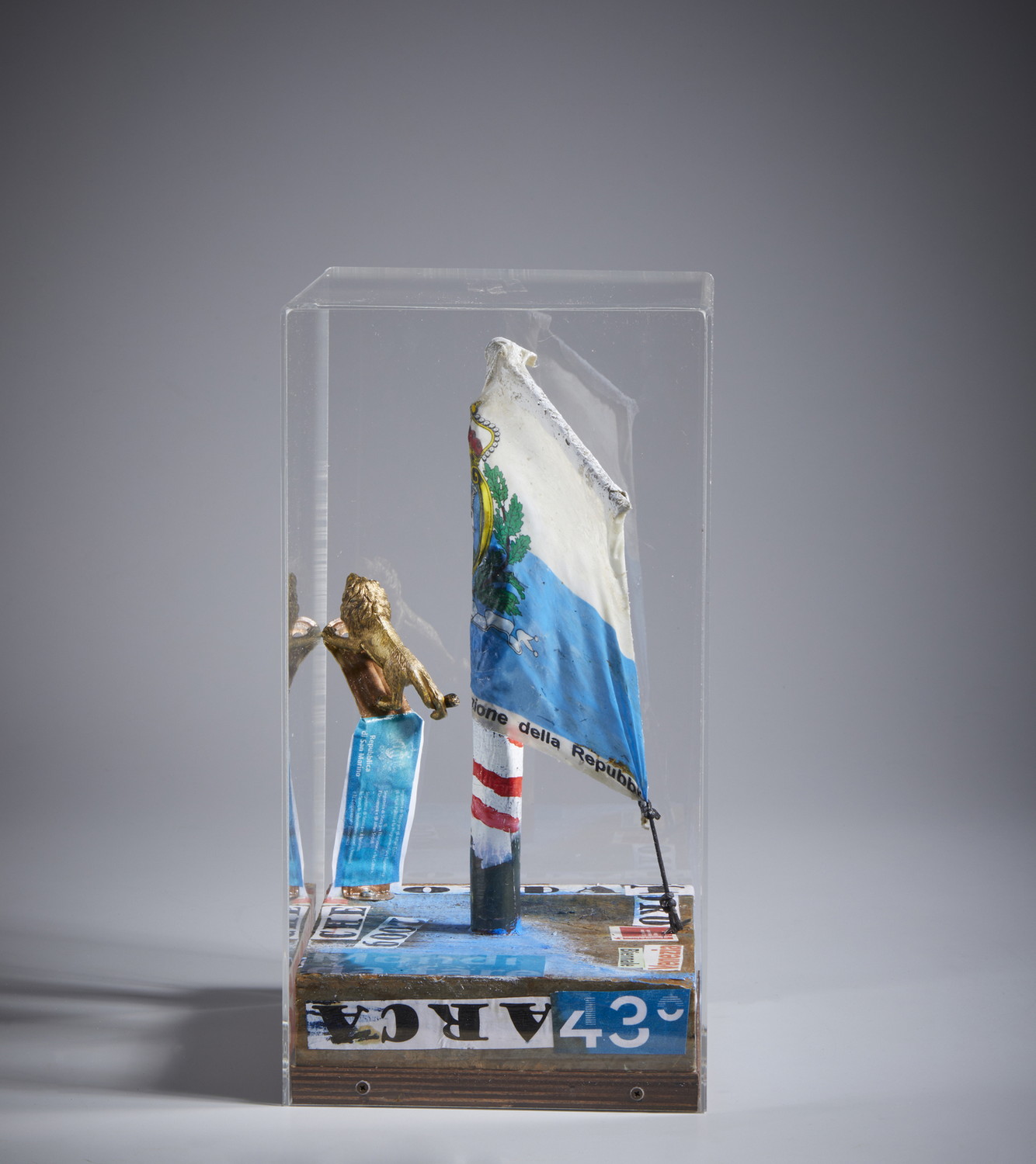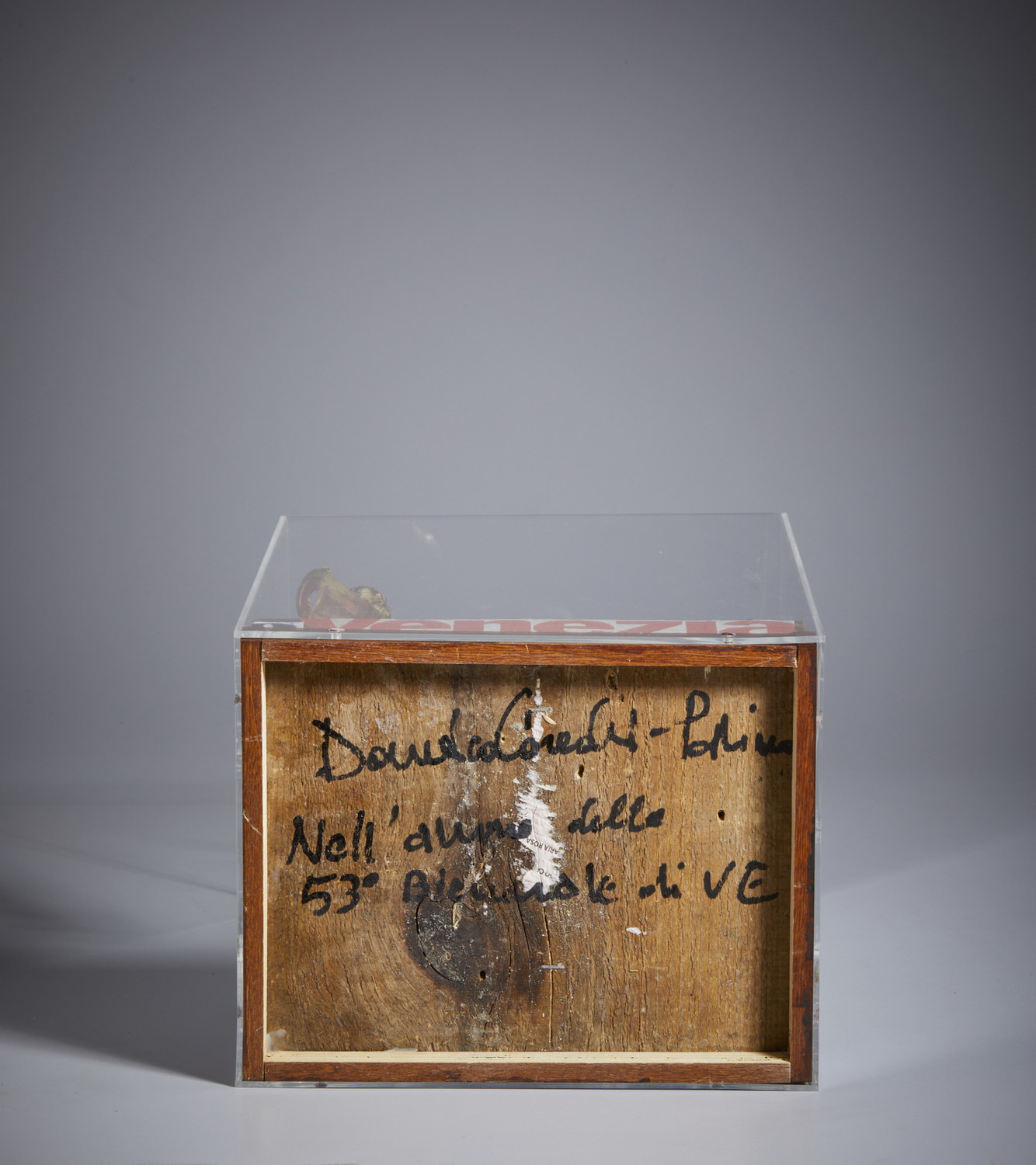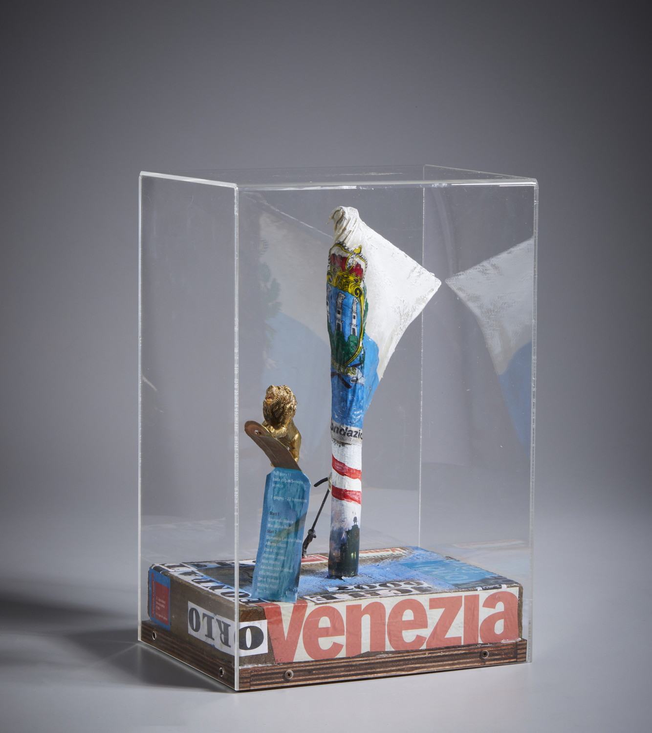 CASADEI DOMENICO (n. 1966) NELL'ANNO DELLA 53 BIENNALE DI VENEZIA, 2009. Tecnica mista e collage su tavola in teca di plexiglass. Cm 27,00 x 40,00 x 21,00. sotto la base titolo e firma.