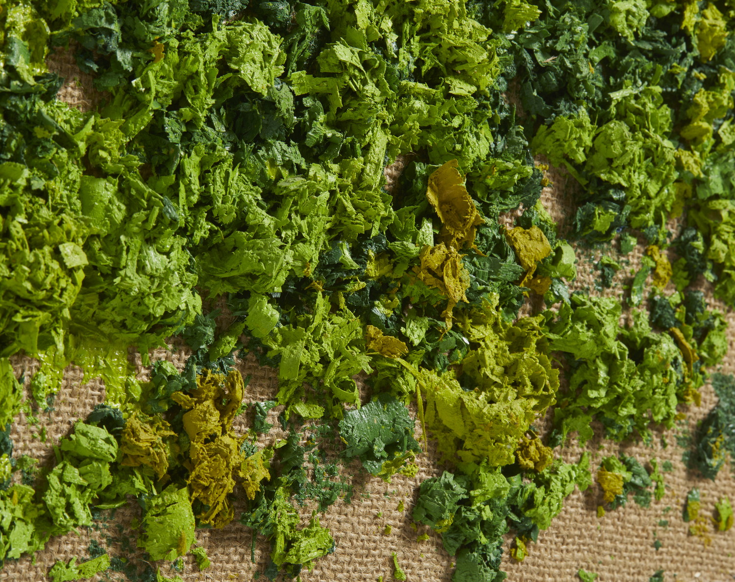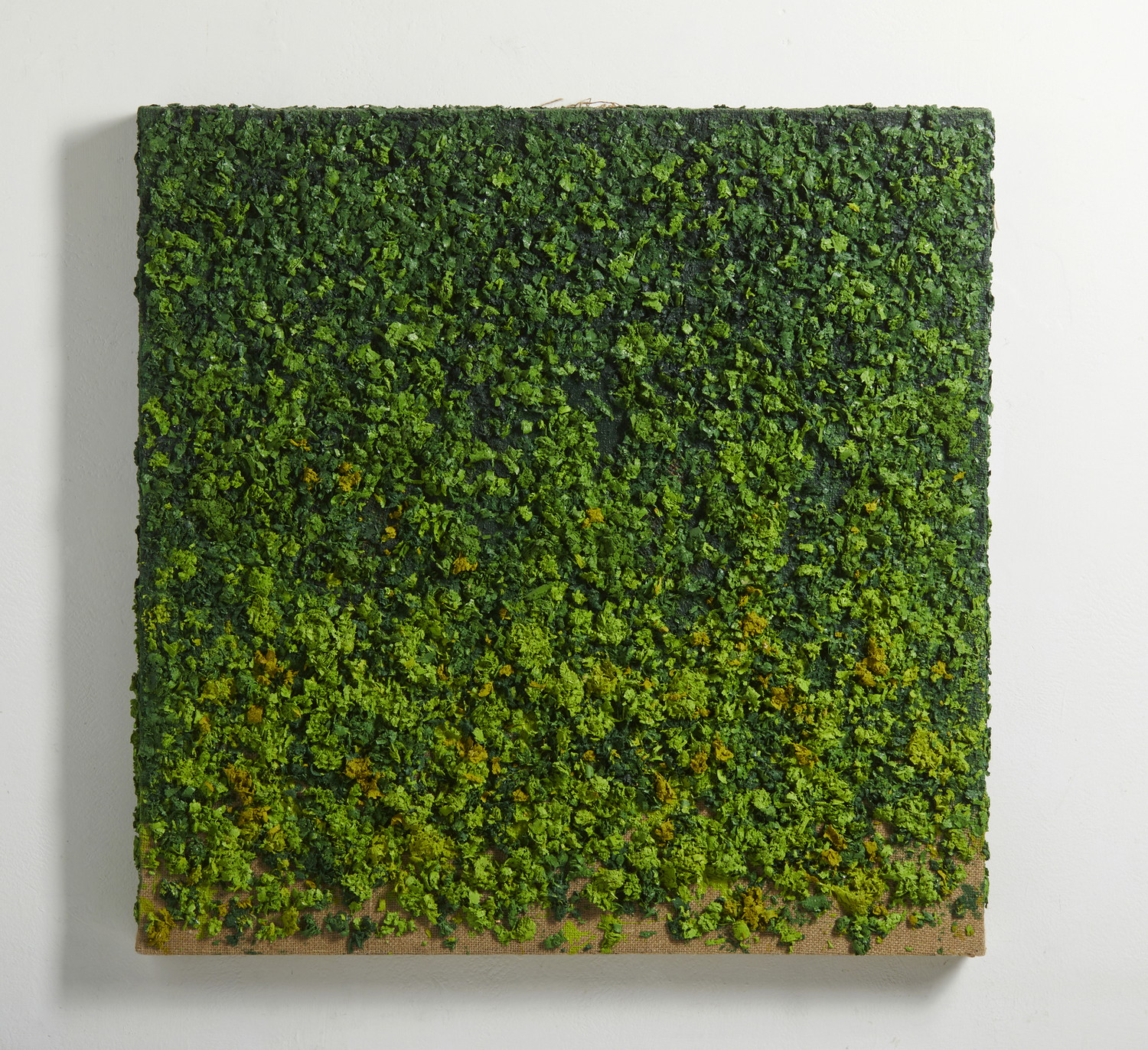 SONDRA SEGALA (n. 1963) GREEN I, 2019. Tecnica mista e collage su tela di juta. Cm 80,00 x 80,00. sul retro: firma e cartiglio dell'artista.