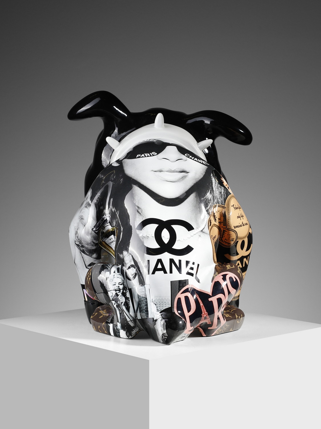 COMERRO CHRISTOPHE (n. 1969) BULLDOG, 2021. Resina dipinta. Cm 45,00 x 39,00 x 31,00. firma e data.