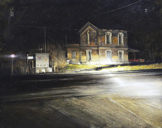 Nicola Nannini NOTTE E CASA SOLITARIA II, 2002 Olio su tela applicata su tavola, cm. 40x50. Opera firmata al verso.