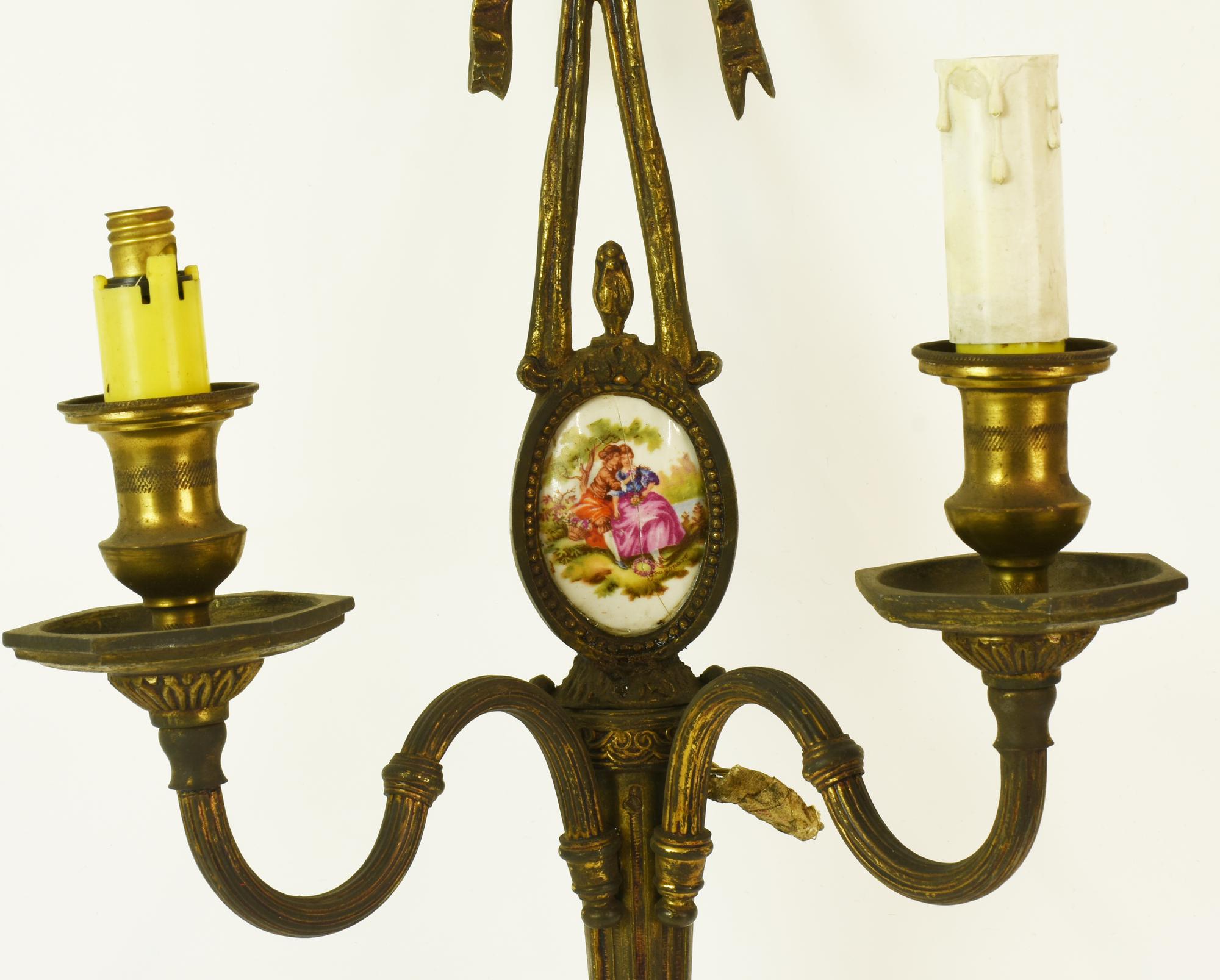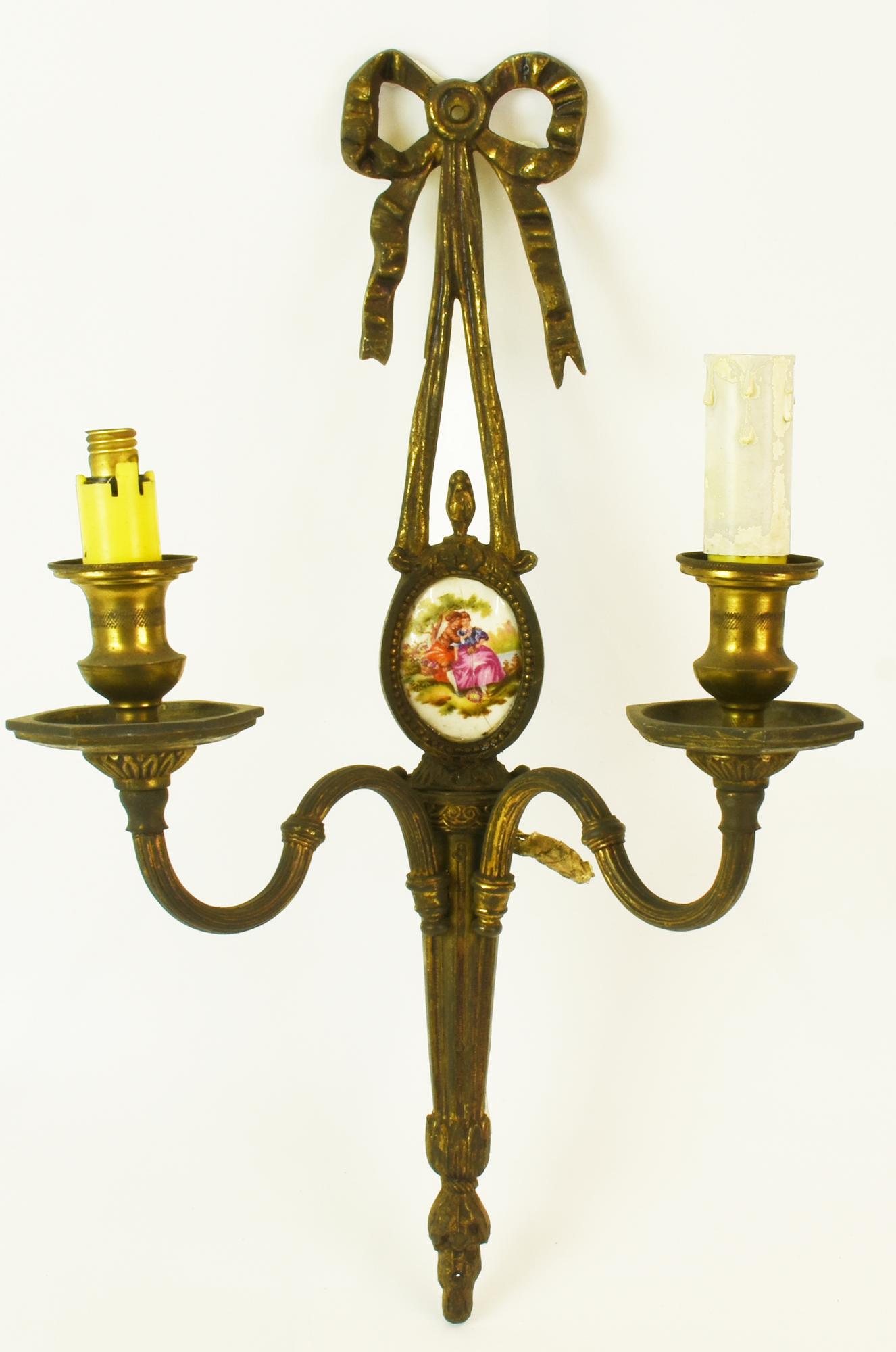 APPLIQUE in ferro battuto a due fuochi, cm 44x20 ca. con inserto in ceramica...