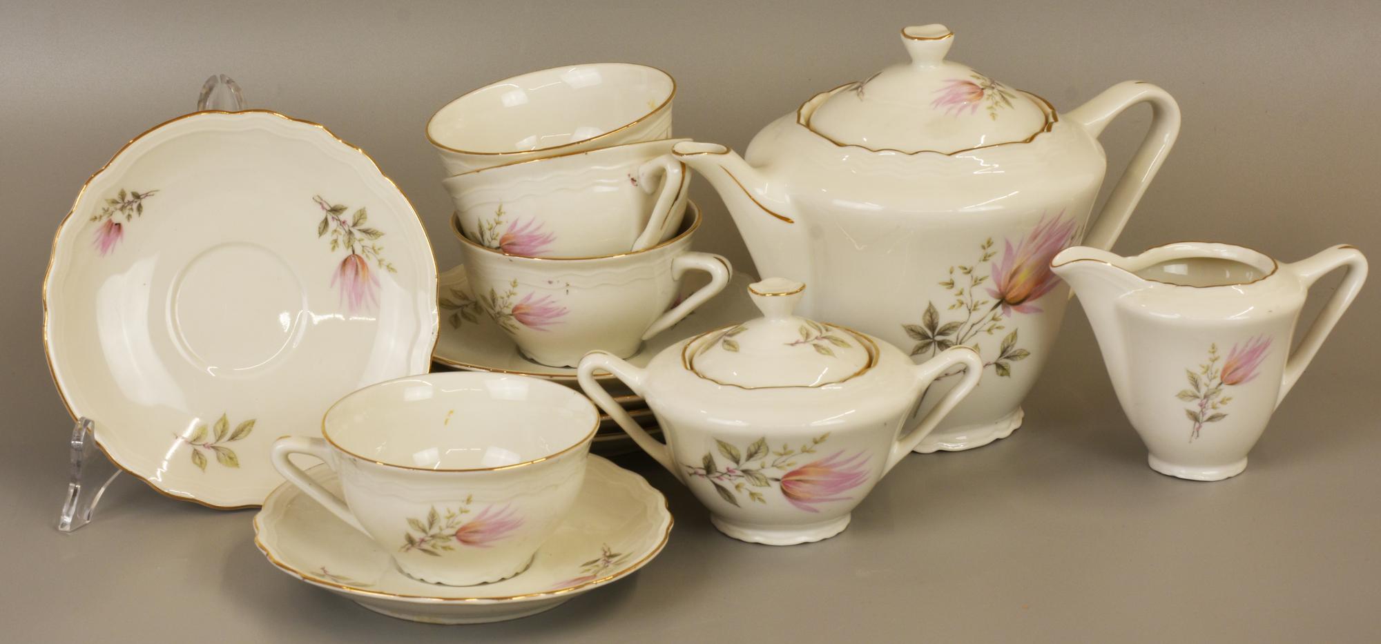in porcellana decorata a motivi floreali, composto da 4 tazze, 6 piattini, teiera, zuccheriera e lattiera