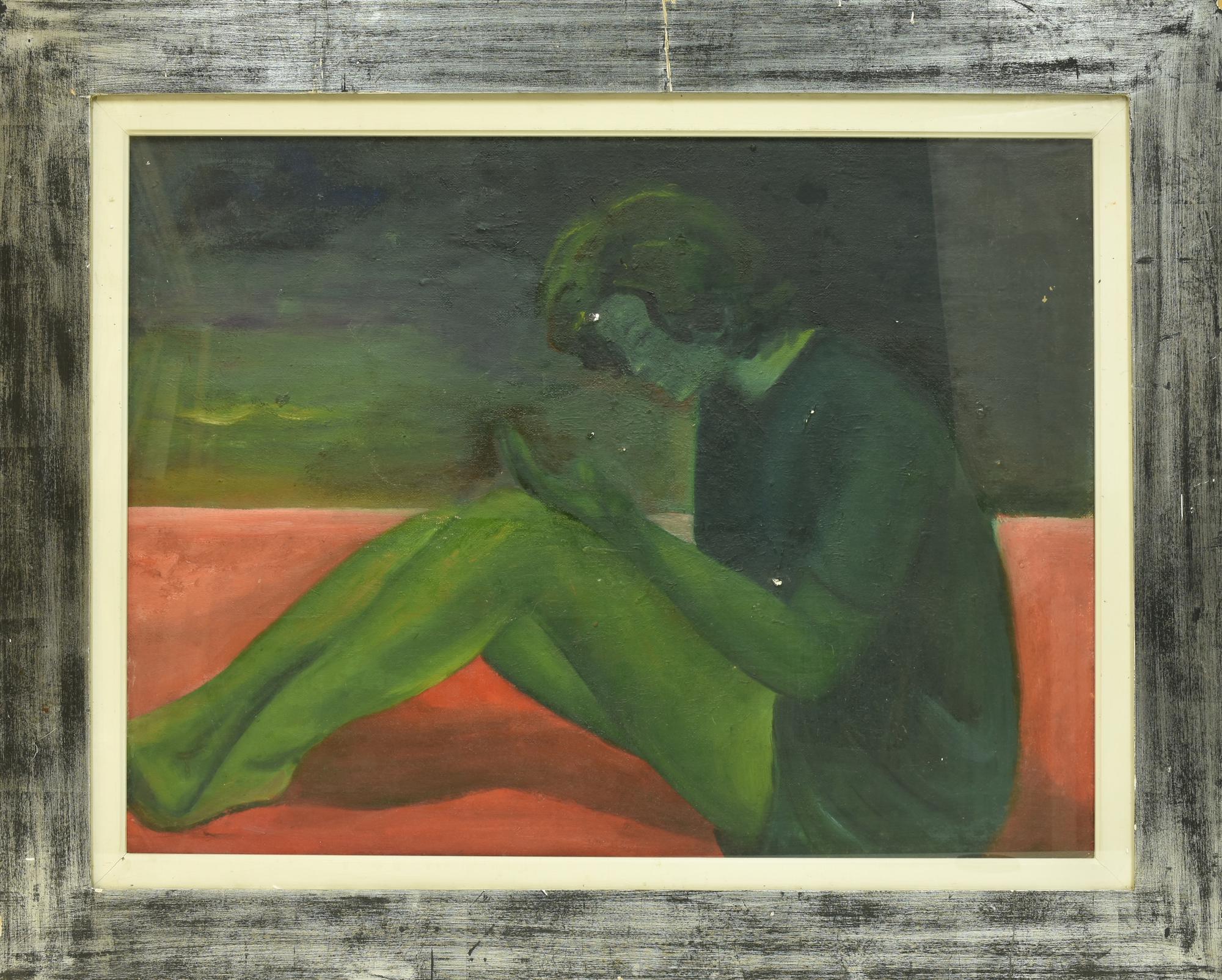 Anonimo DONNA VERDE SU FONDO ROSSO olio su masonite, 60x80 cm al retro:...