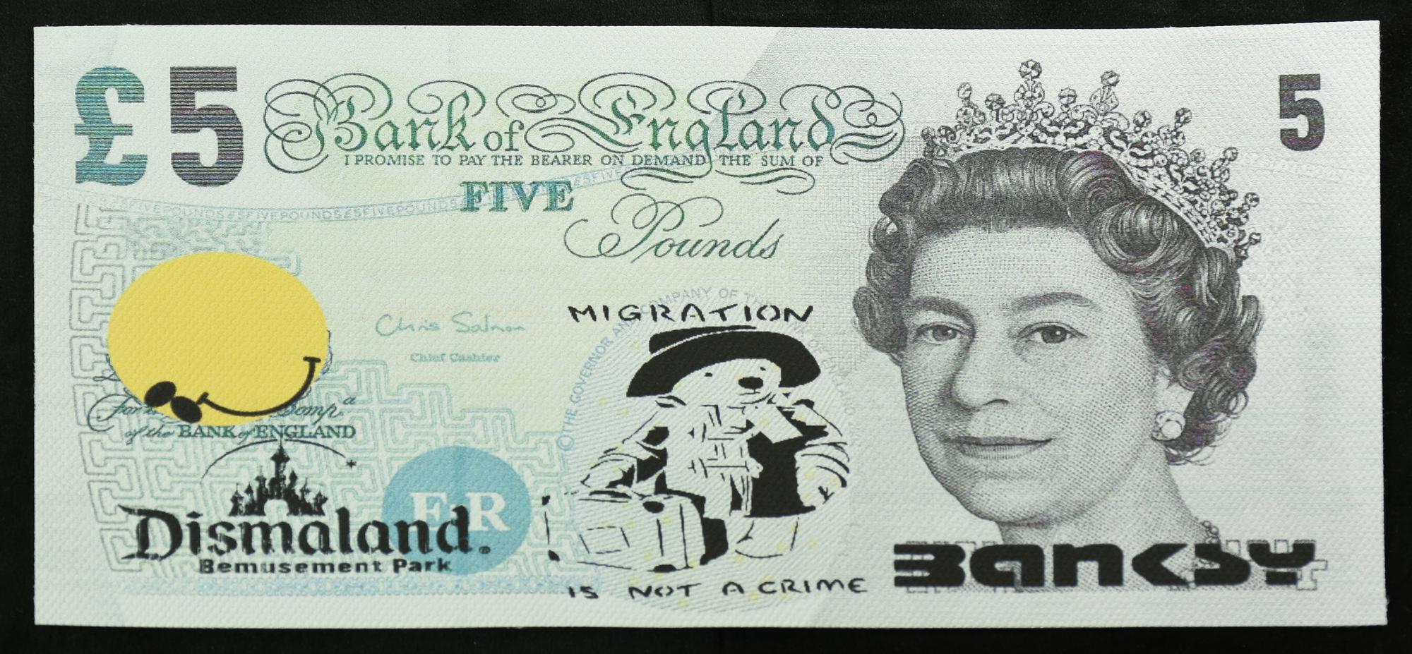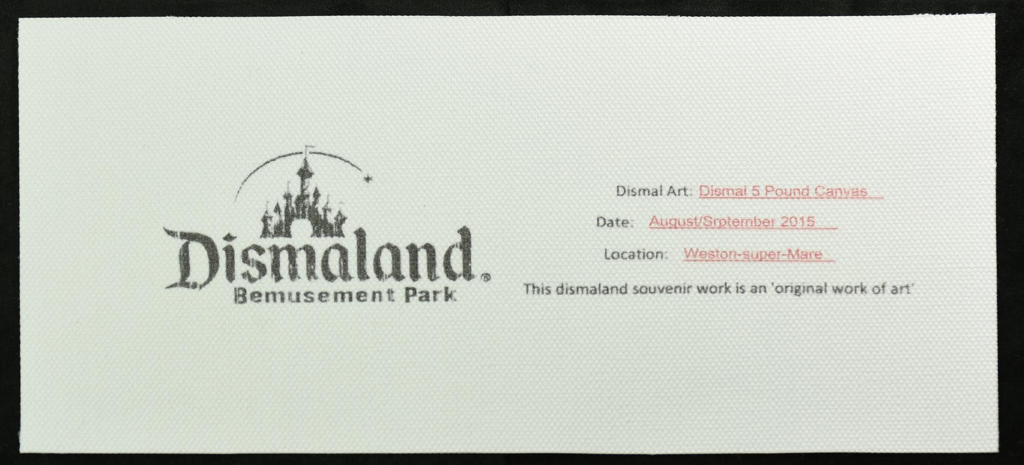 Banksy DISMAL 5 POUND CANVAS, 2015 serigrafia su tela, cm 9x18 sul retro:...