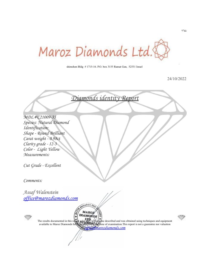 2 DIAMANTI NATURAL POLISHED 0,98 CARATI COLORE GIALLO CHIARO - PUREZZA I1-2 - TAGLIO BRILLANTE - CERTIFICATO GEMMOLOGICO MAROZ DIAMONDS LTD MEMBRO ISRAEL DIAMOND EXCHANGE - C21009-35