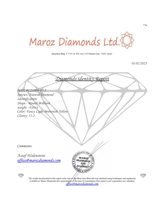 DIAMANTE NATURAL POLISHED 0,63 CARATI COLORE FANCY CHIARO MARRONCINO GIALLO - PUREZZA I1-2 - TAGLIO BRILLANTE - CERTIFICATO GEMMOLOGICO MAROZ DIAMONDS LTD MEMBRO ISRAEL DIAMOND EXCHANGE - C21009-67-3