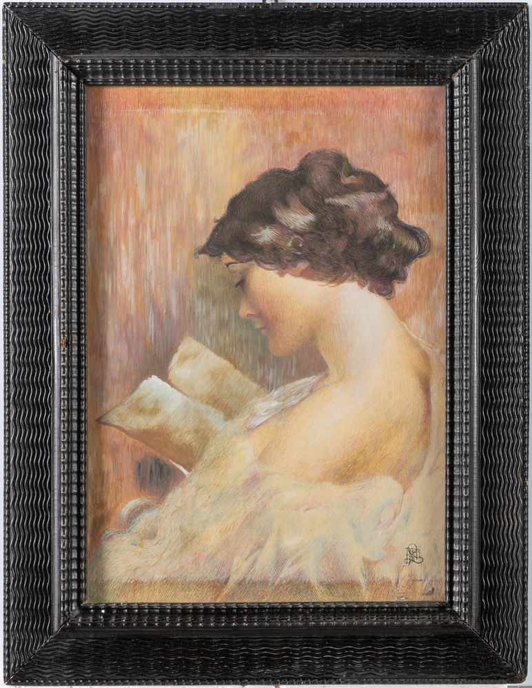 L. BARRI (inizio del XX secolo) "Donna che legge". Tecnica mista su carta. Cm 53x37. Opera firmata in basso a destra.