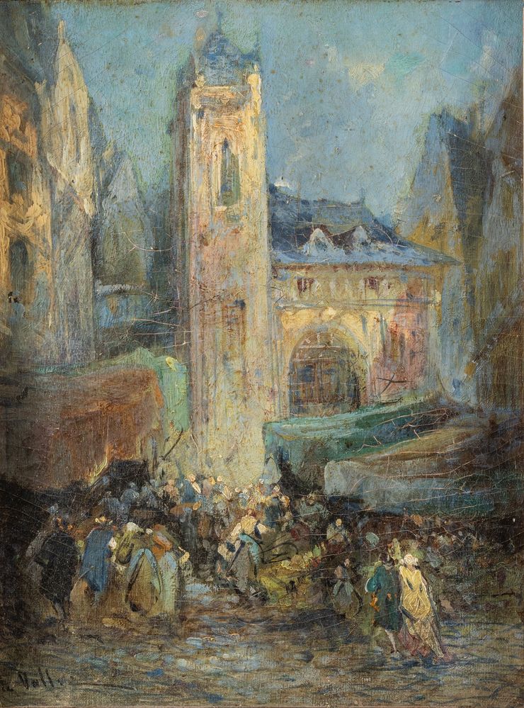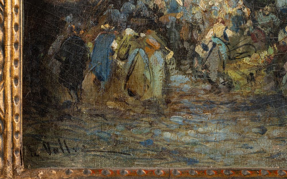 Pittore del XX secolo. "Scena di mercato". Olio su tela. Cm 32,5x25. Opera firmata in basso a sinistra.