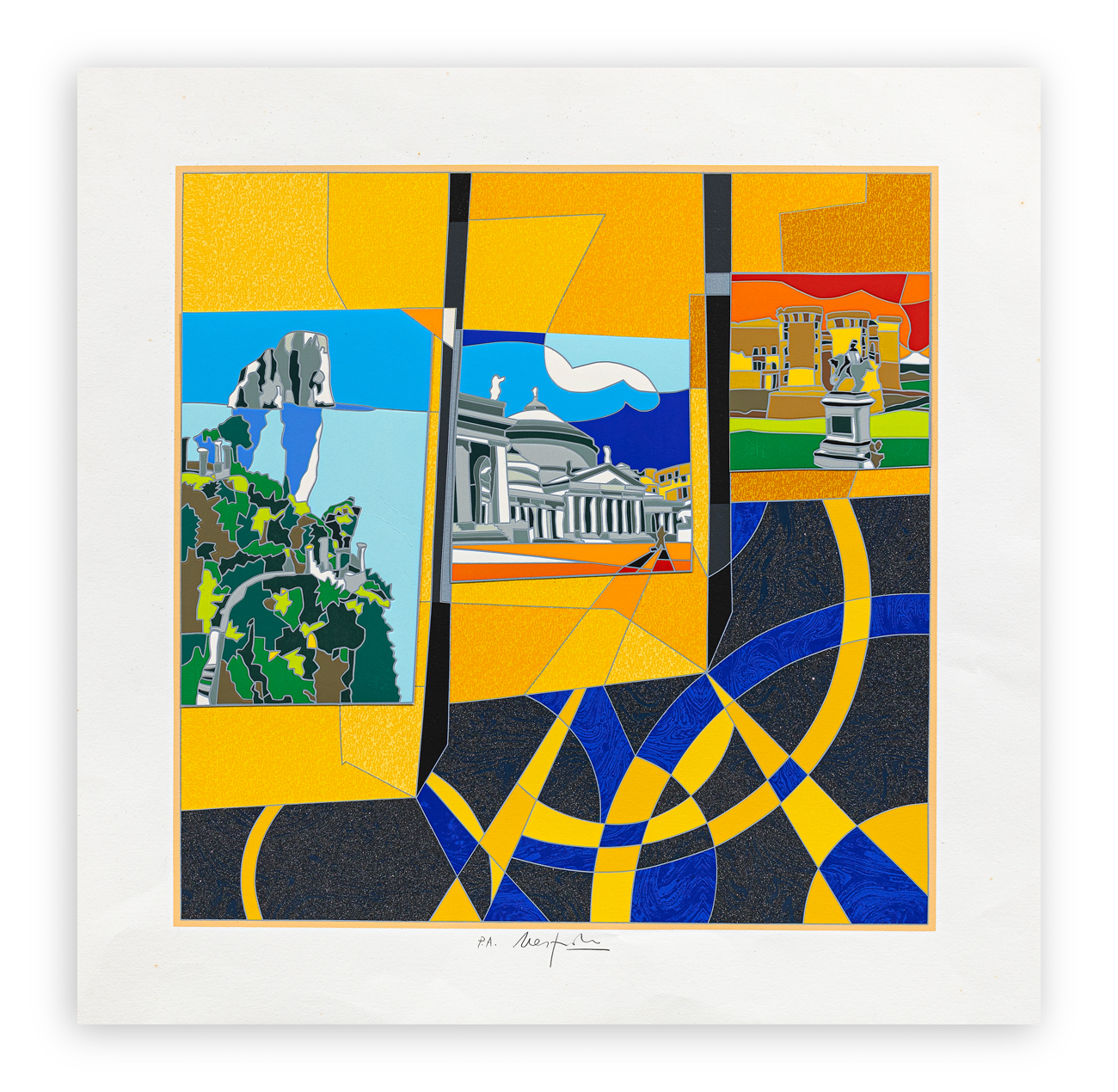 Serigrafia polimaterica con inserto a collage e con interventi in carborundum, floccaggi e passaggio calcografico a secco