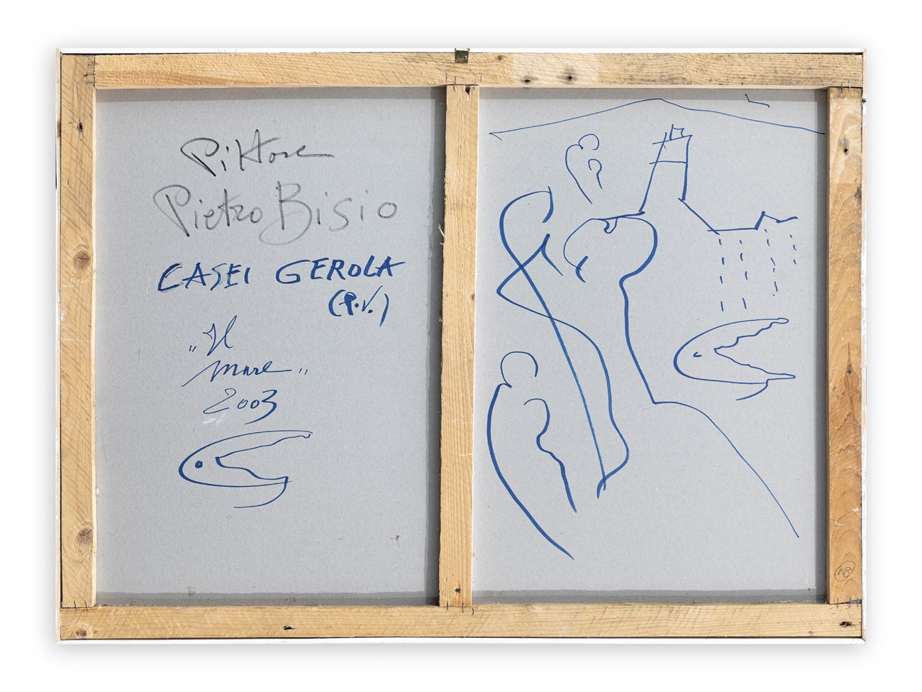 Firma, titolo, datazione, località (Casei Gerola) e disegno dell'Artista al retro