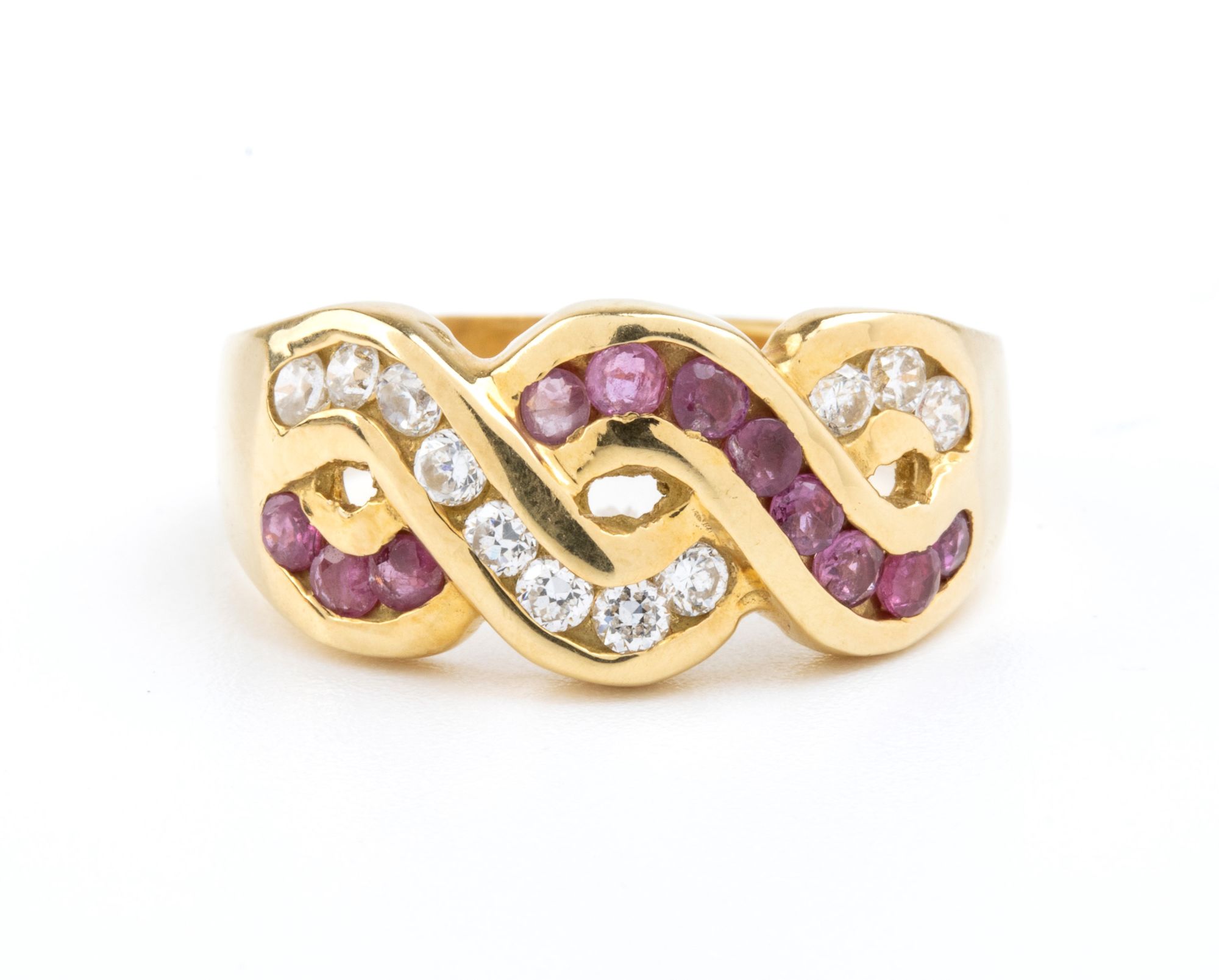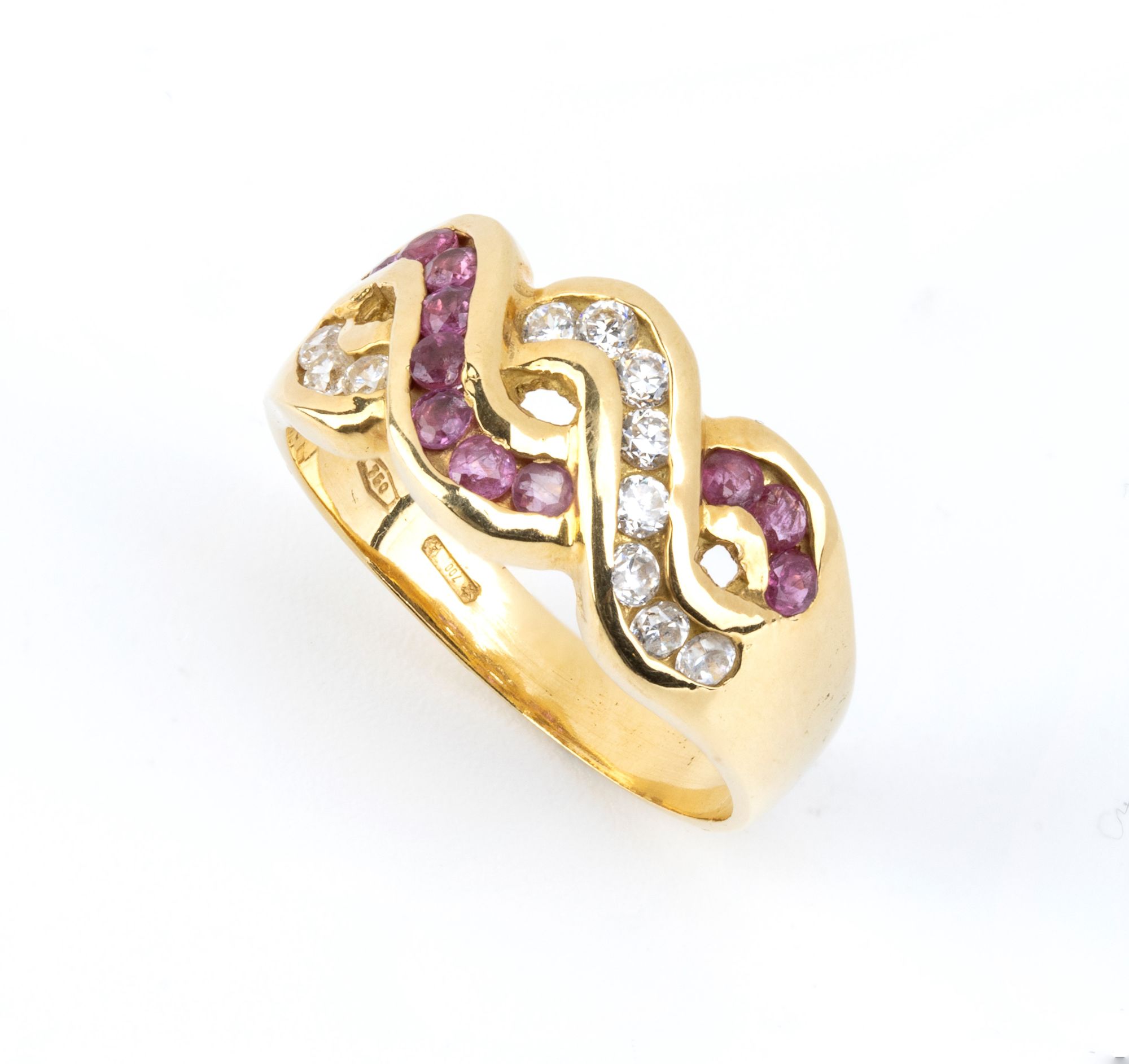 Un anello a fascia con motivo di nastri incrociati in diamanti e rubini,