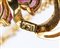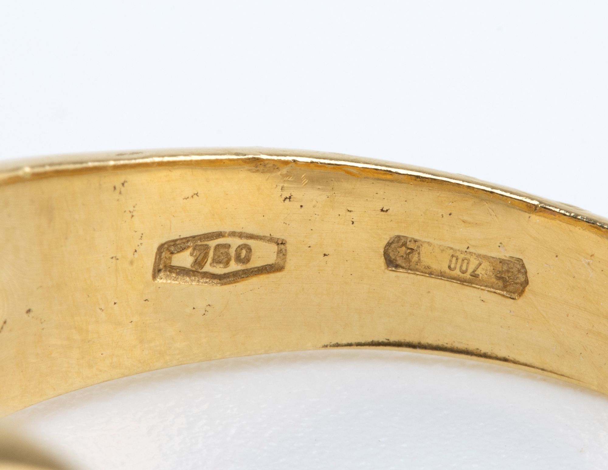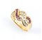 N. 11 diamanti di forma rotonda, taglio brillante, circa 0.45 ct, G.H, VVS-VS; n. 11 rubini, forma a goccia, taglio composito, circa 0.55 ct. Punzonato "750 - 700 VI". Misura IT 21 - US 9 1/2.