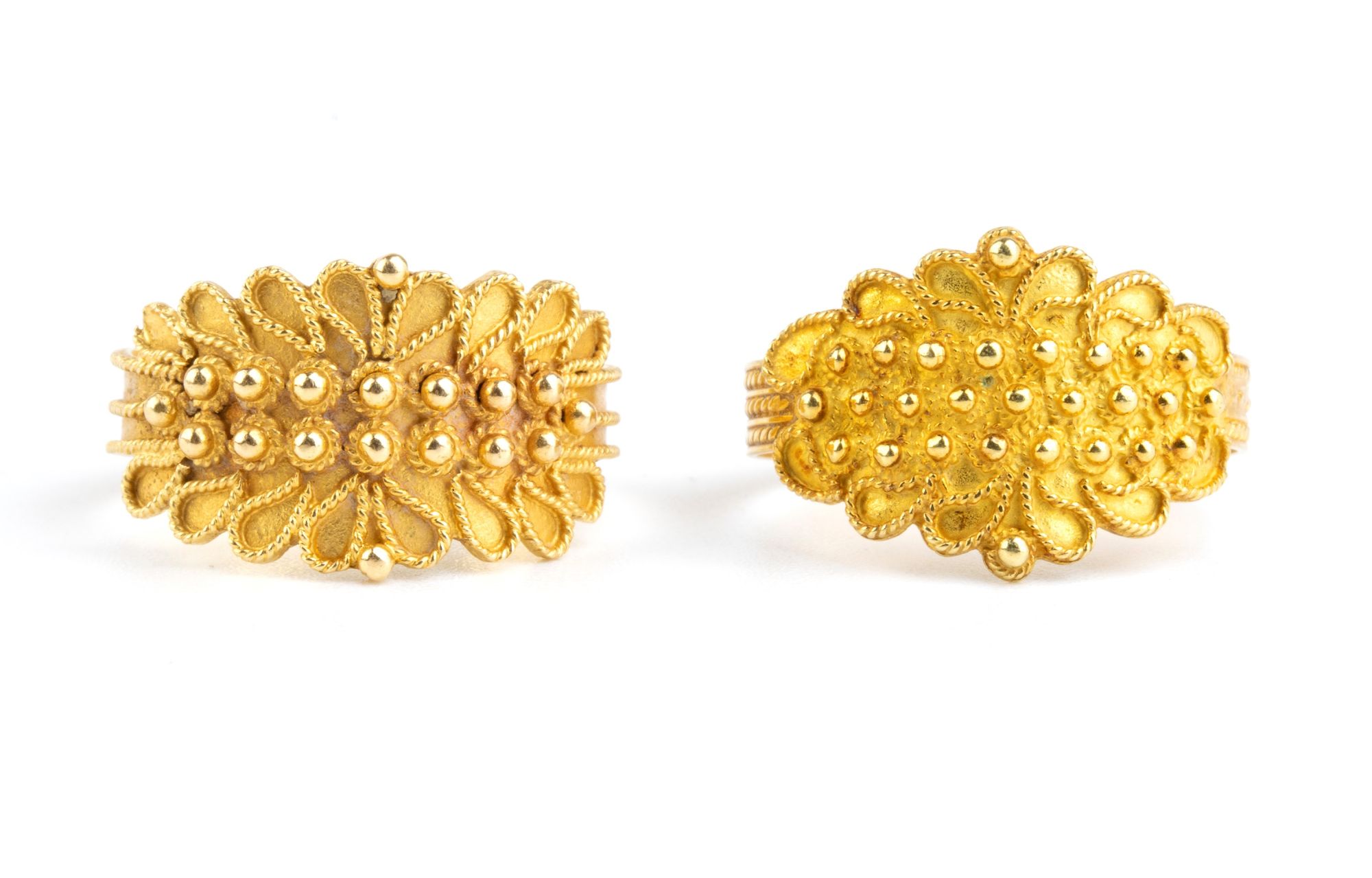 Anello con due file di grani, punzonato "750 - 44 SS - Andrea Piluzzo". Misura IT 17 - Misura USA 8.