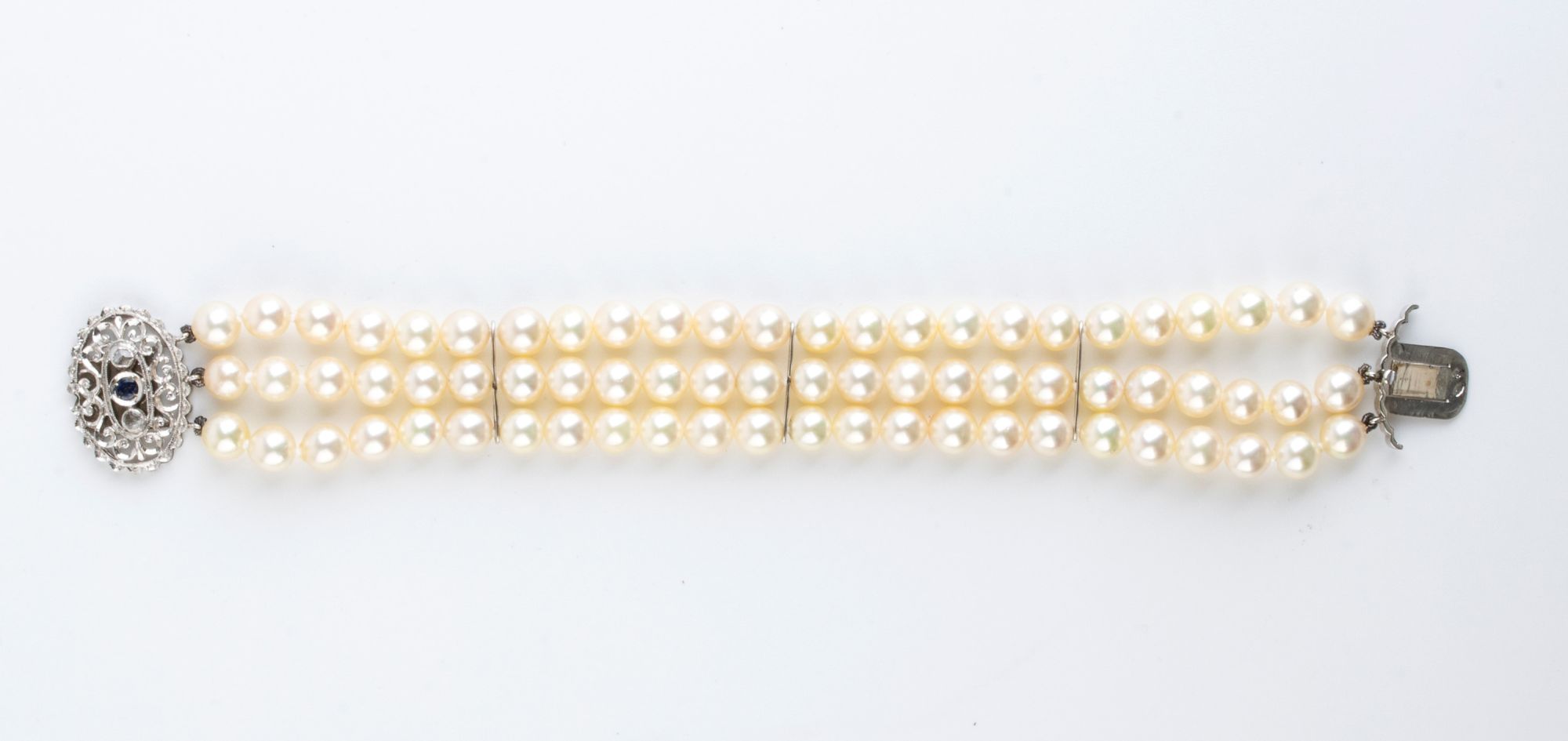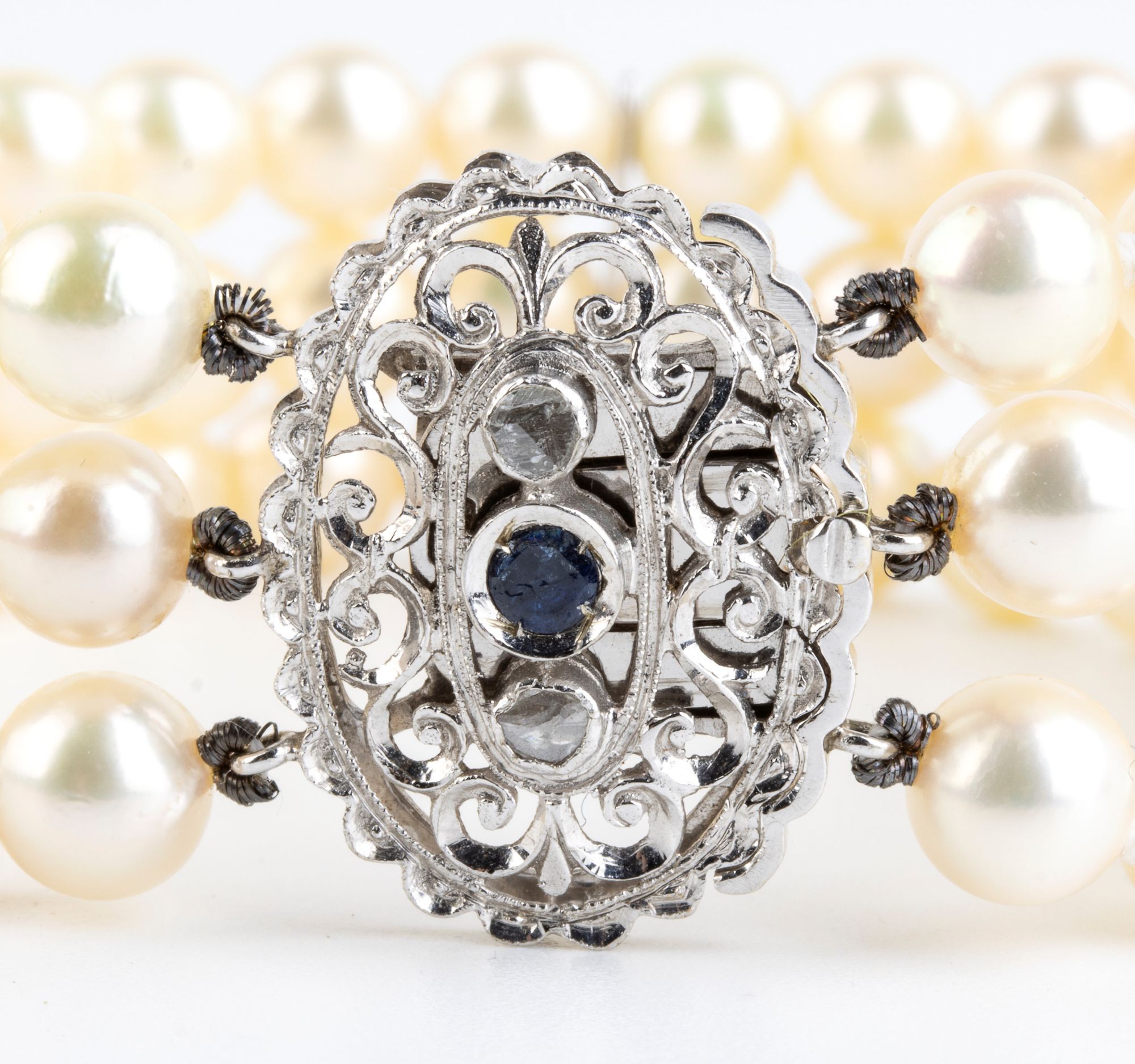 tre fili di perle coltivate d'acqua salata, con fermezza in oro bianco 18k,