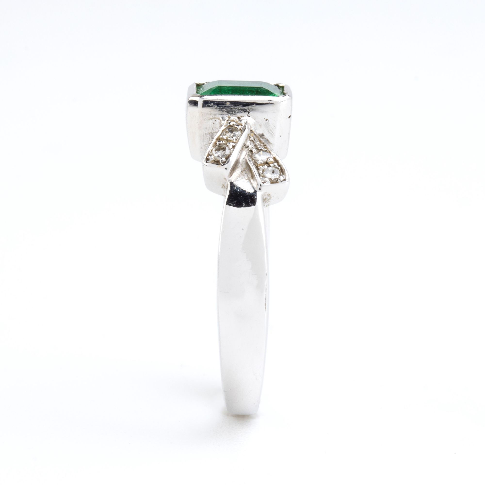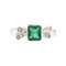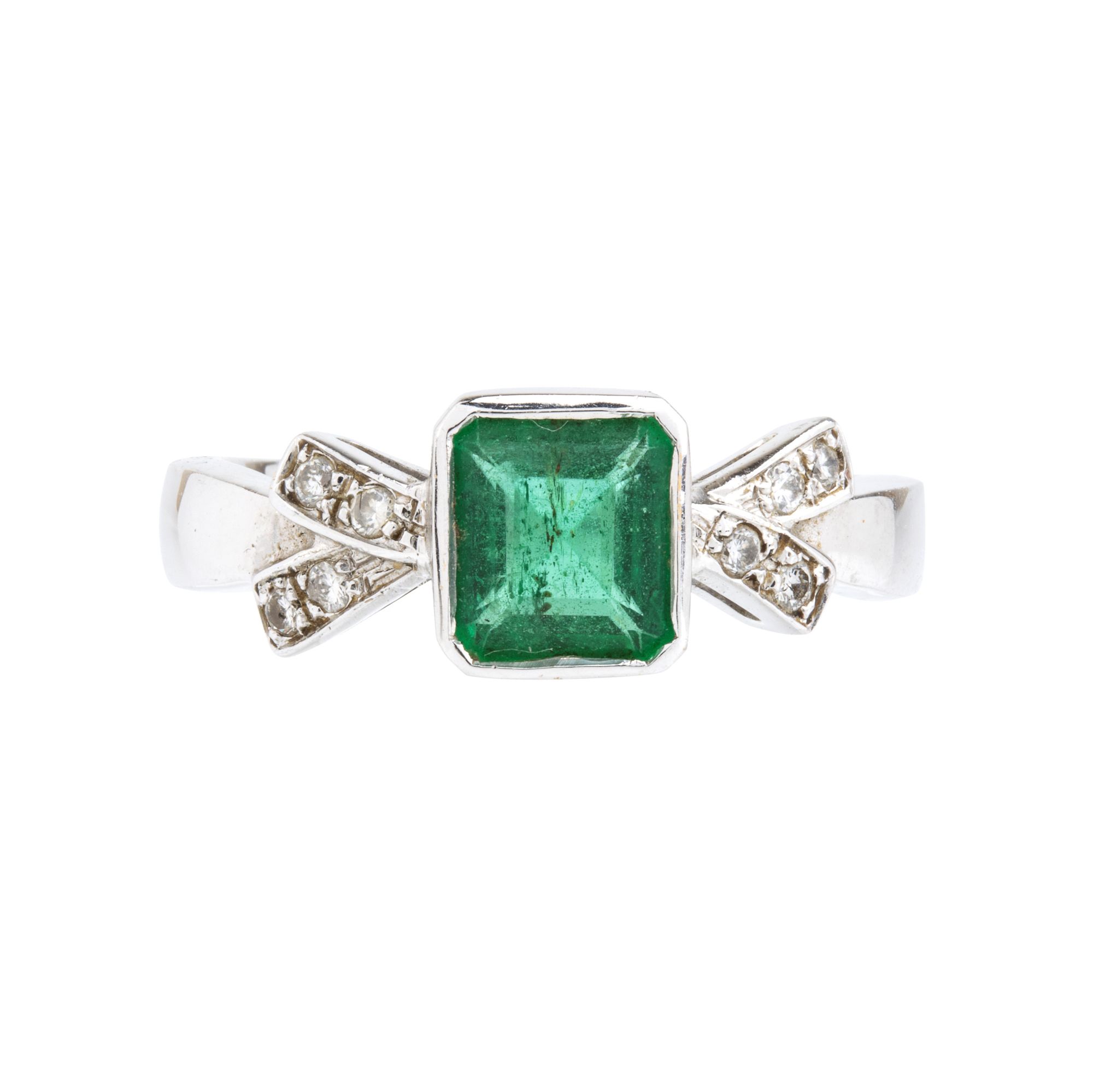 in oro bianco 18k, motivo a fiocco con diamanti e smeraldo centrale.