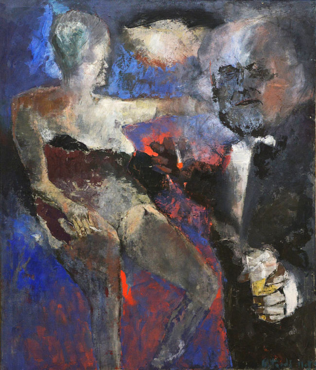 Ugo Attardi NOTTI ROMANE, 1959 Olio su tela, cm.140x120. Autentica su foto dell’Artista, Opera registrata presso l’Archivio Storico Ugo Attardi in Roma, al retro etichette: La Nuova Pesa – Antologica Artisti Italiani – Mostra Mercato.
