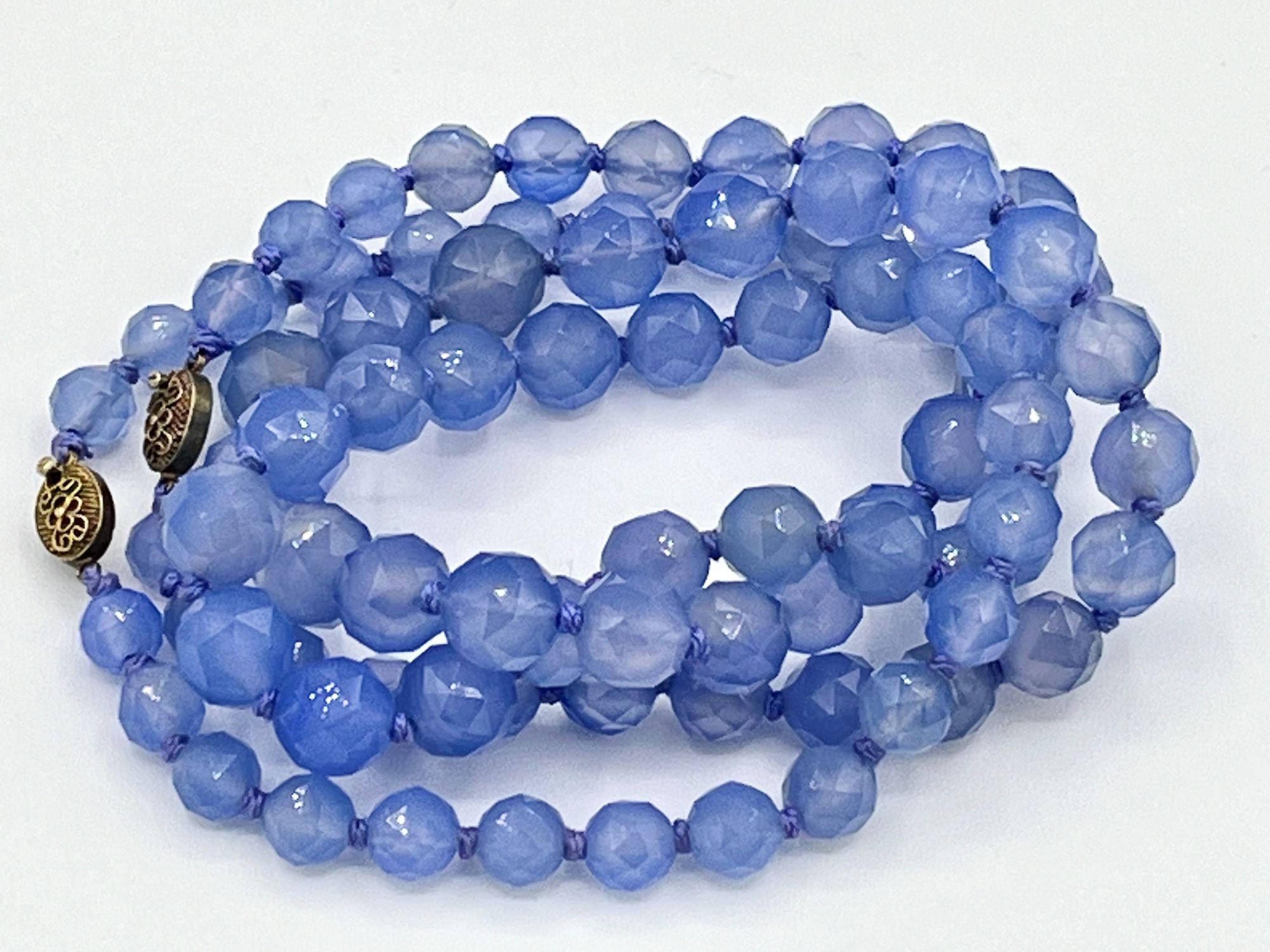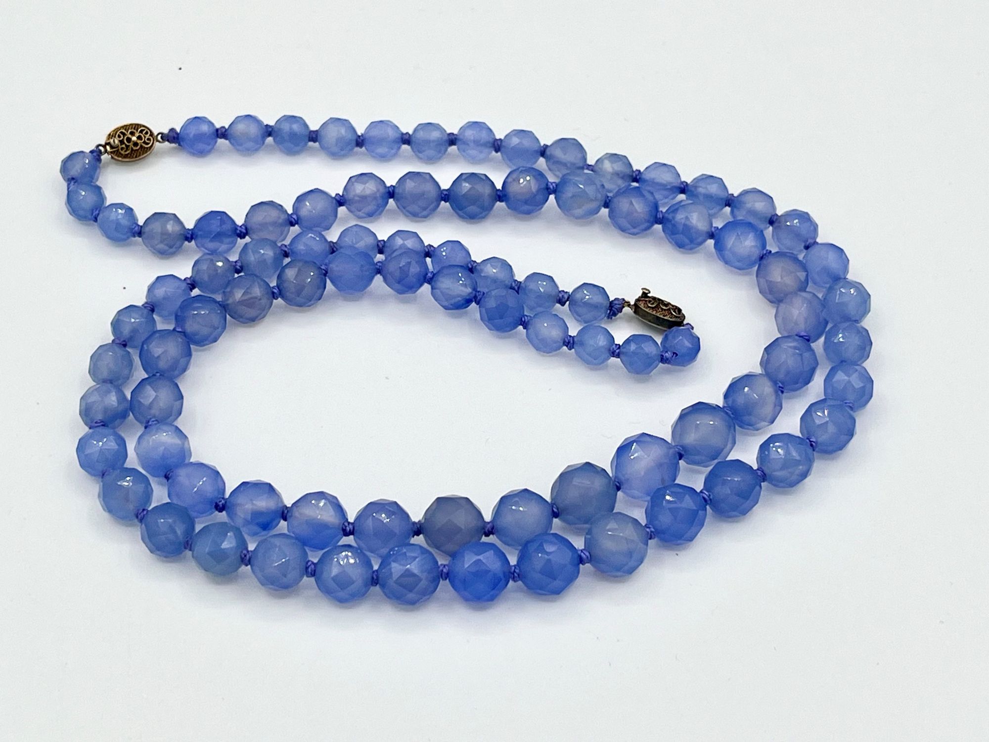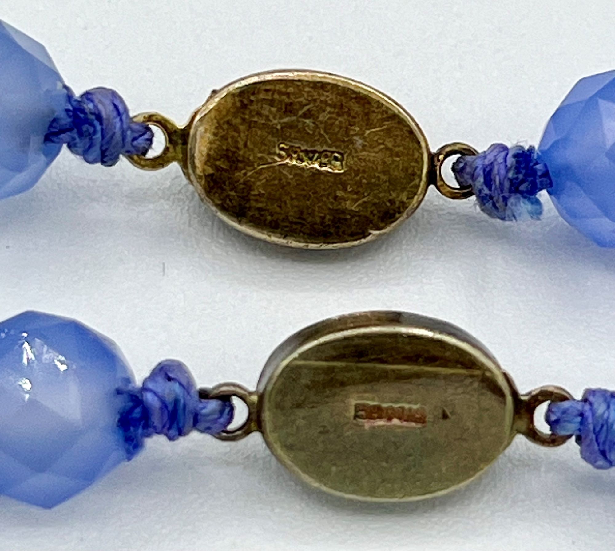 argento dorato 900/1000, ad un filo di sfere sfaccettate di calcedonio.