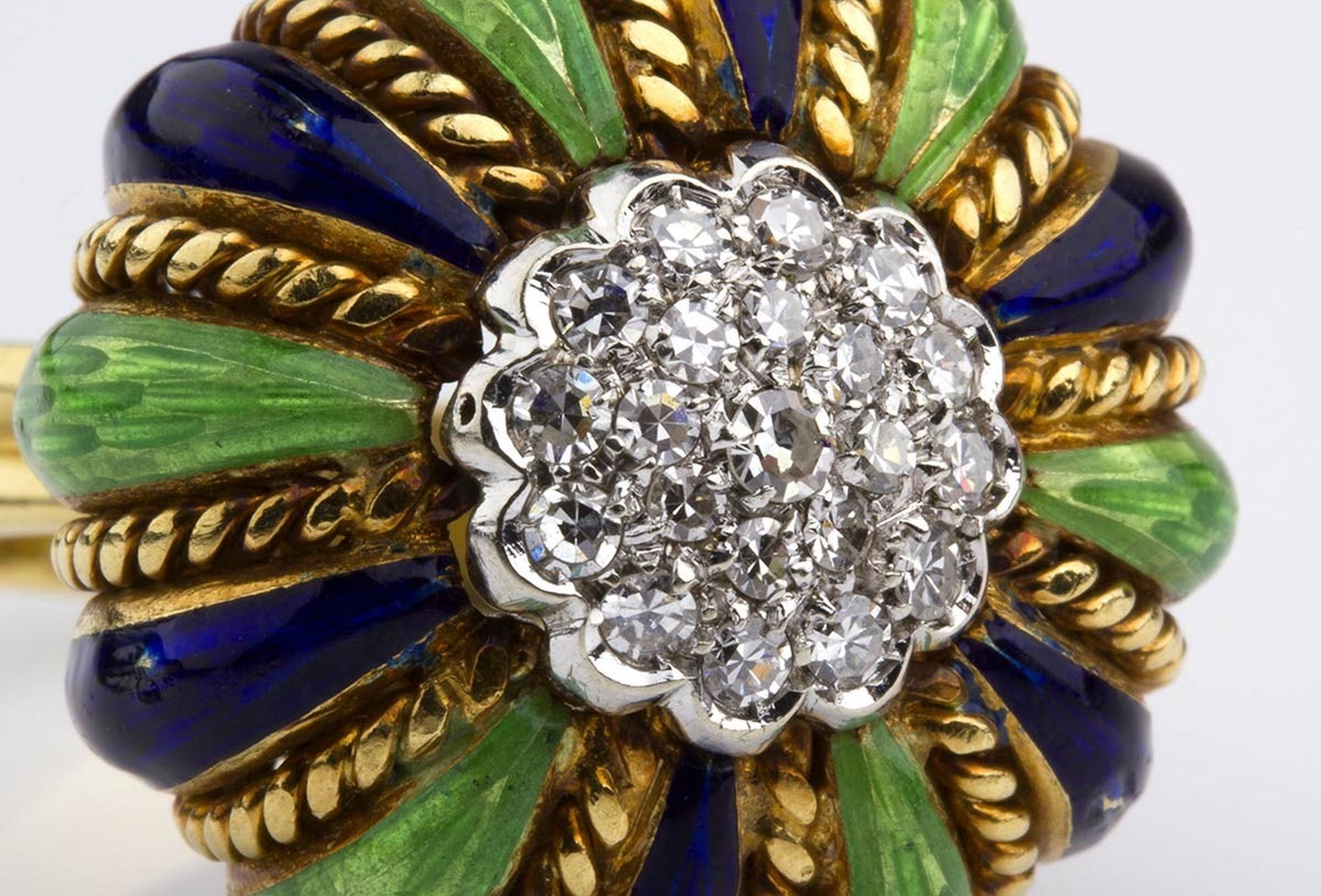 in oro giallo 18k a forma di zucca, impreziosito da pavé di ventuno diamanti contornato da smalti blu e verdi. Diamanti di forma rotonda, taglio brillante 0.90 ct circa, colore G-H, purezza VVSI-VSI. Punzonato "18K".