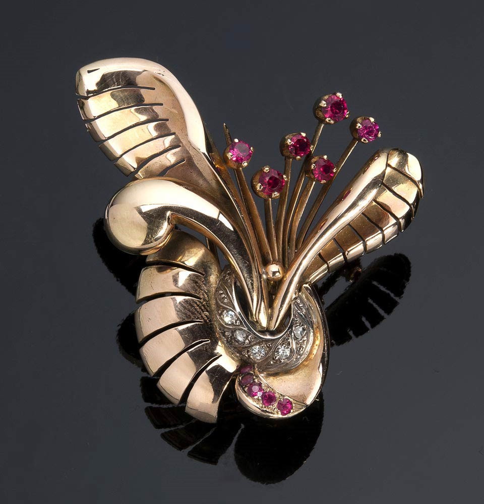 in oro 18k con rubini di sintesi, diamanti taglio huit-huit 0,15 ct, colore H, purezza VS.