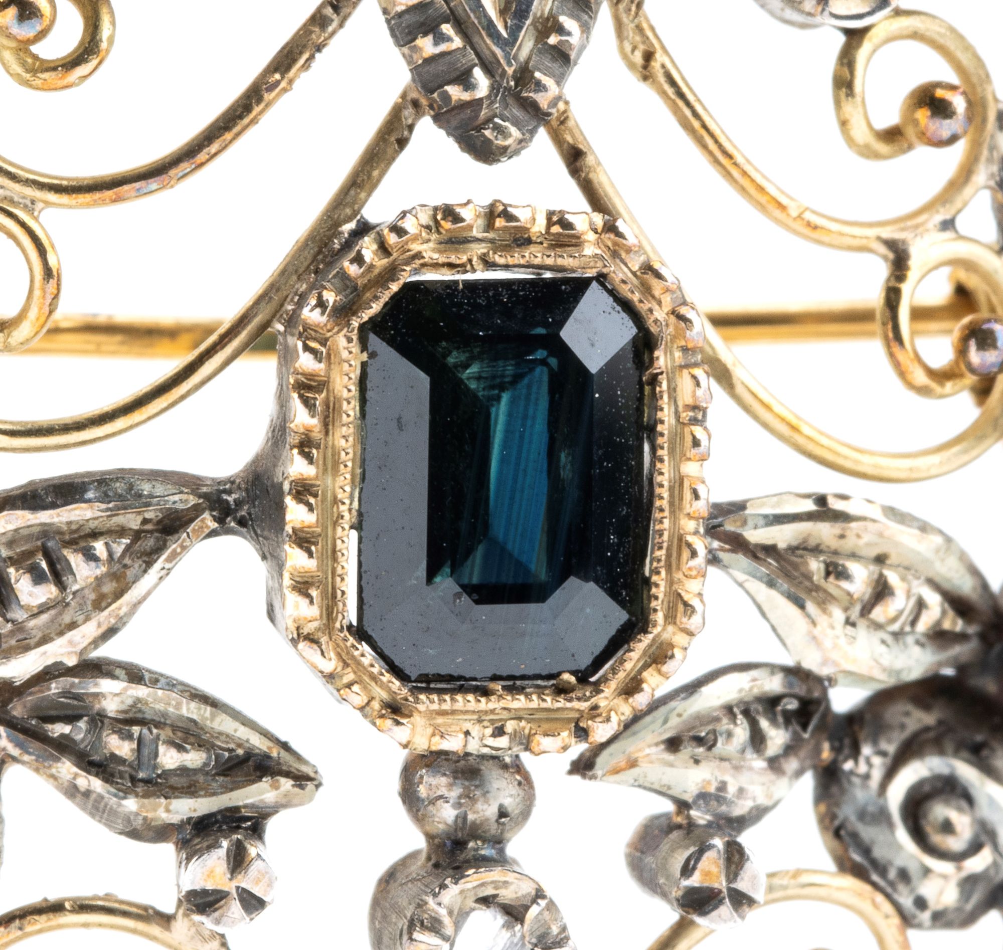 in oro a basso titolo e argento, databile tra il 1890 e il 1920, con tre perle grigie pendenti, diamanti taglio a rosa e zaffiro centrale di forma ottagonale,