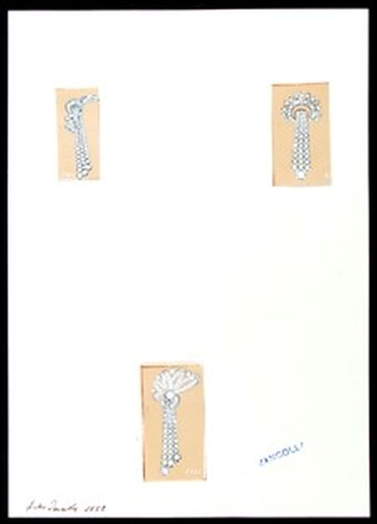 disegni di tre orecchini con diamanti.Tre tecniche miste su velina applicata su cartoncino.Stato di conservazione: **** buono.