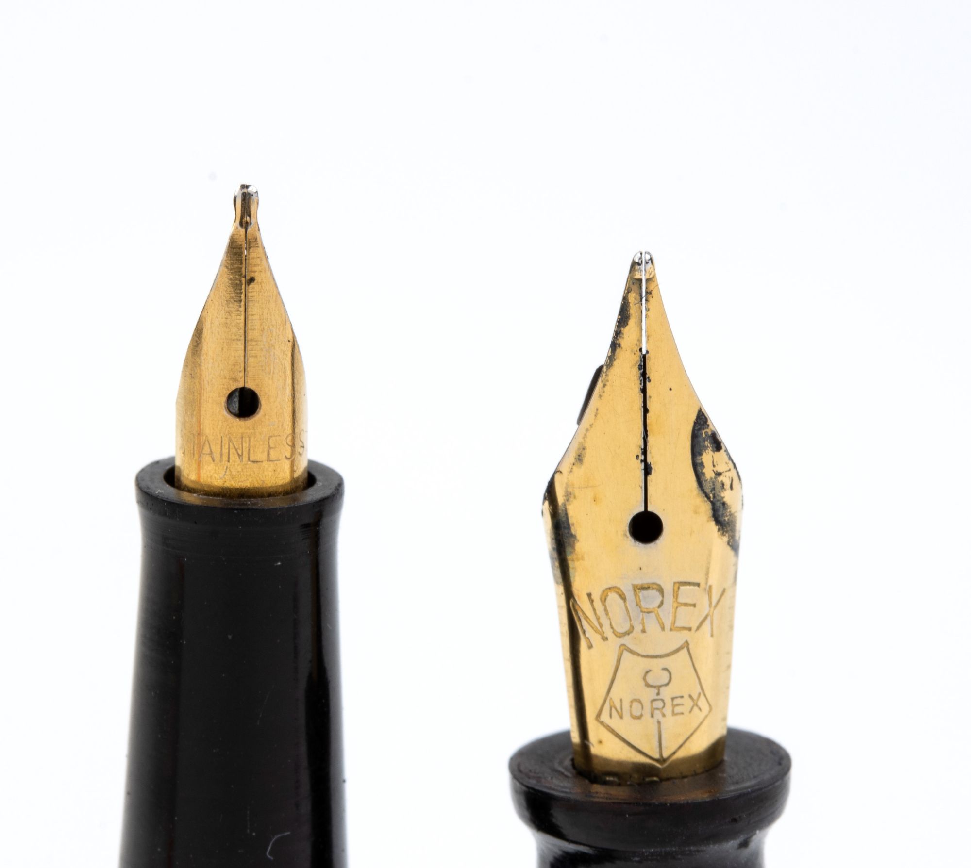 Norex con sistema di caricamento a stantuffo, pennino in acciaio con dicitura "Norex"