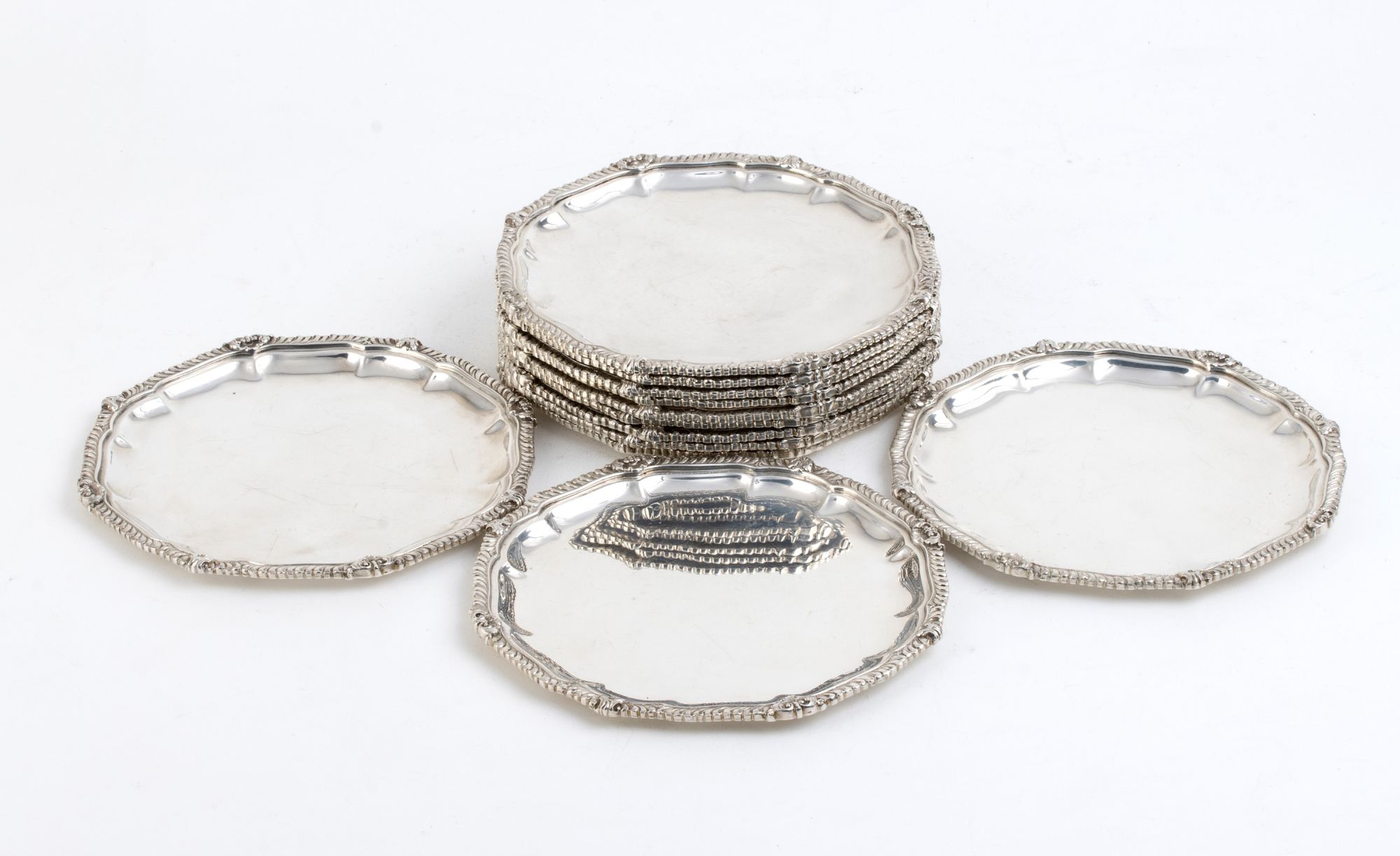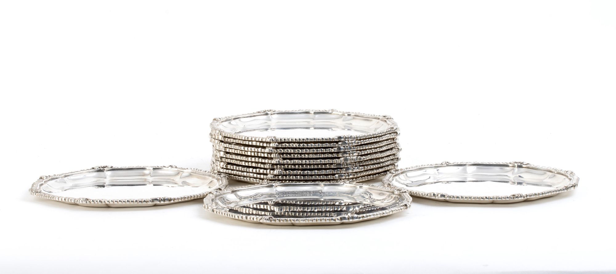 Dodici piatti da pane - Argentiere Ilario Pradella, seconda metà del XX secolo Dimensioni 17,5 x 17,5 cm. Peso complessivo 2987,5 gr.