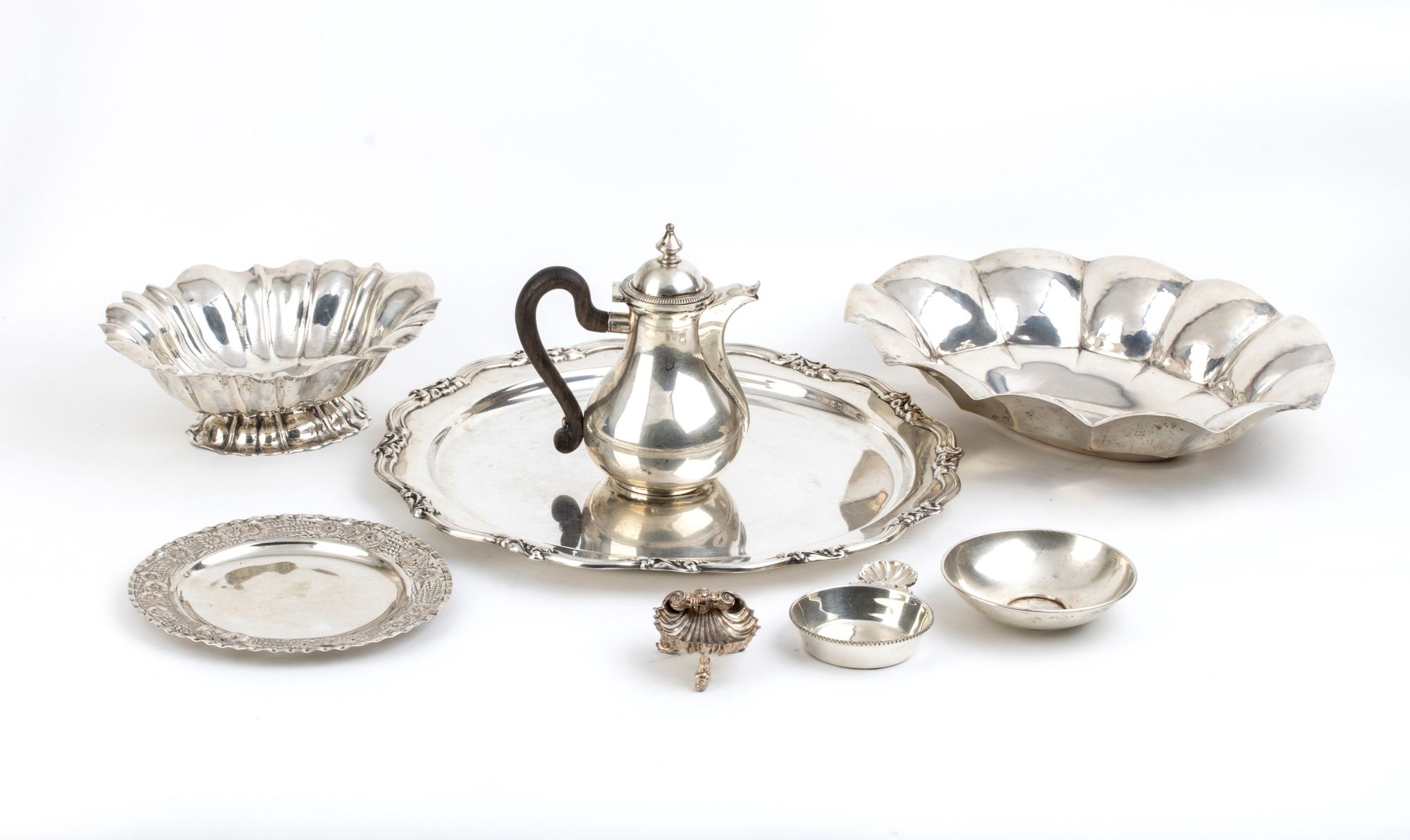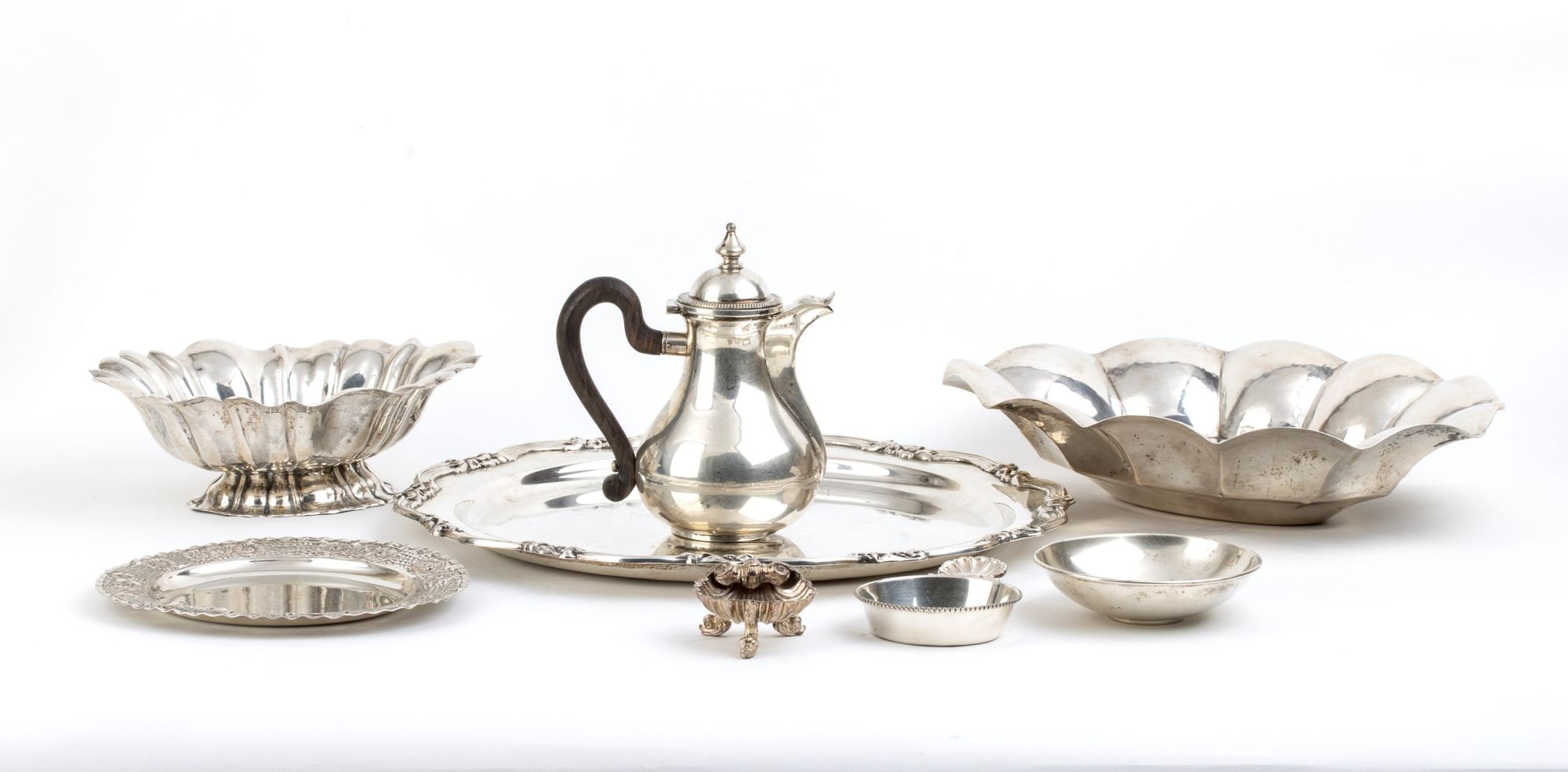 Lotto di otto oggetti assortiti in argento Peso complessivo 2050 gr.