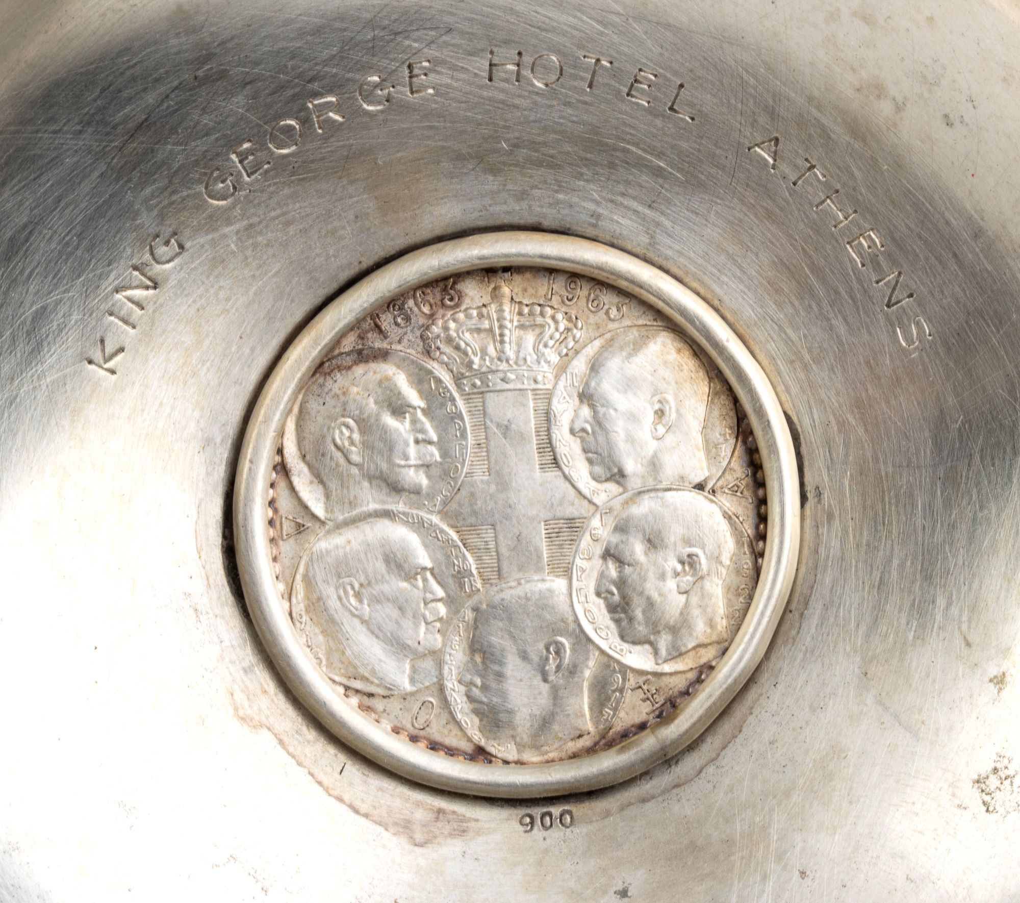 6) Coppa con moneta al centro: 10,3 x 10,3 cm. Marchi: "900 - KING GEORGE HOTEL ATHENS".
