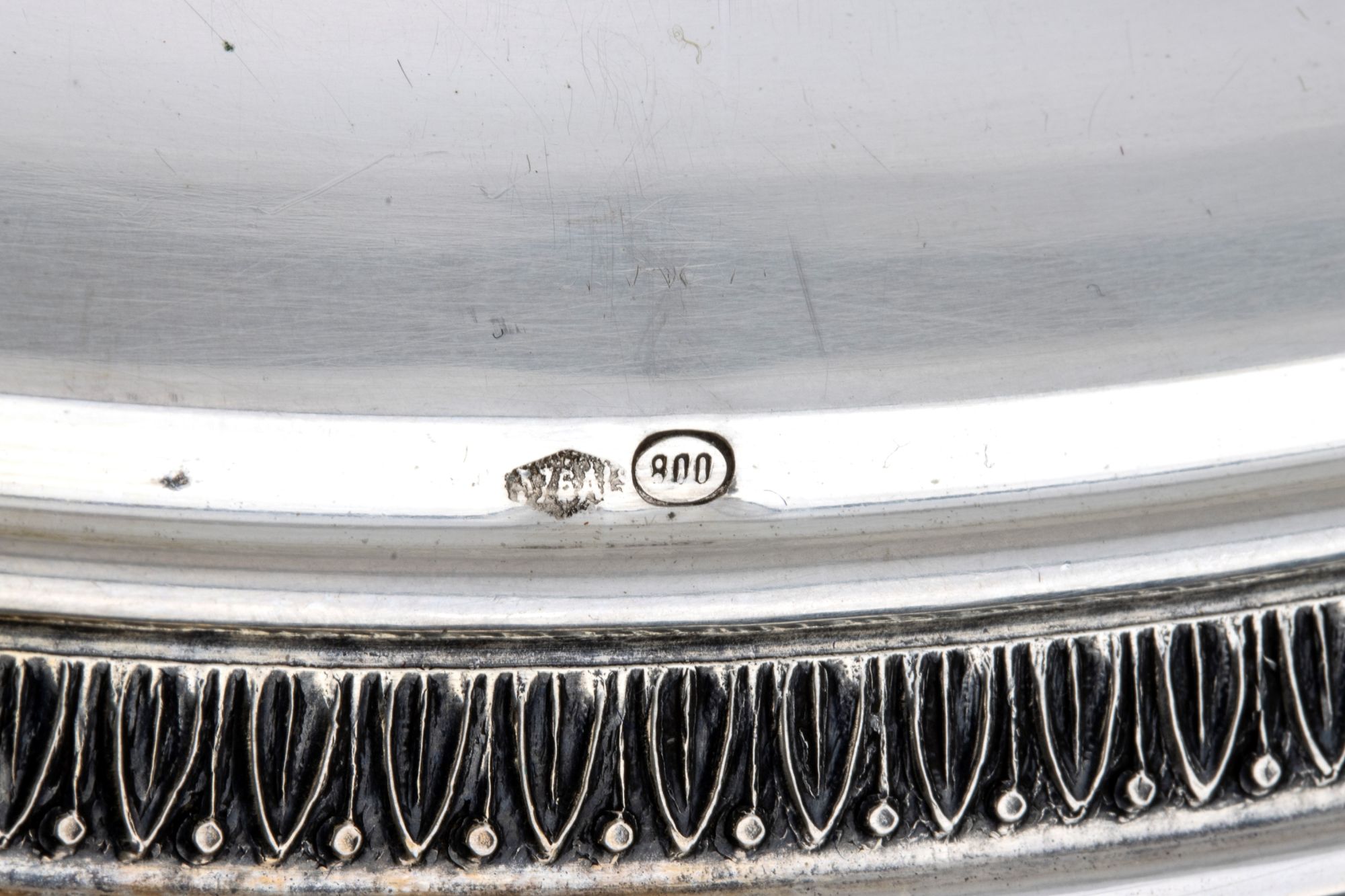 1) Un piatto con decorazione stile impero: dimensioni 35 x 35 cm. Punzonato "800 - 576 AL".