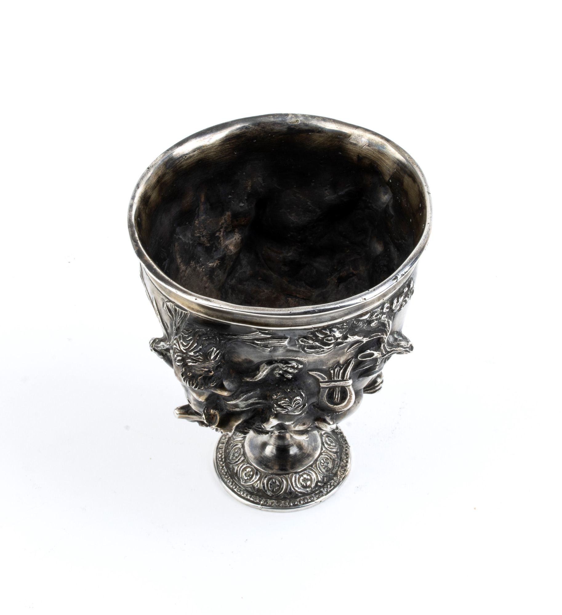 Coppa in argento con scene mitologiche - Italia XX secolo Altezza x Lunghezza x Profondità: 12 x 9,5 x 9,5 cm. Peso 750 gr.