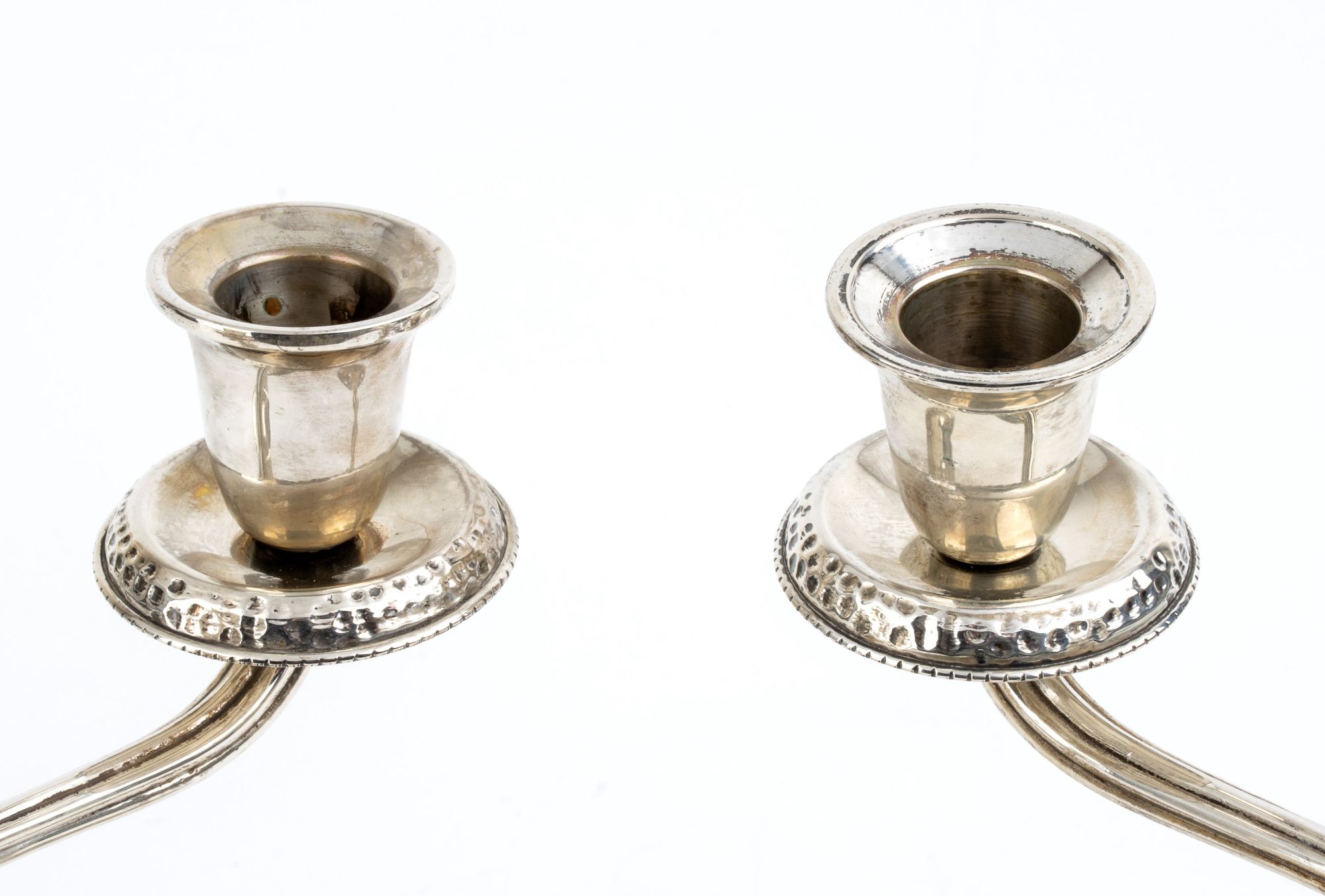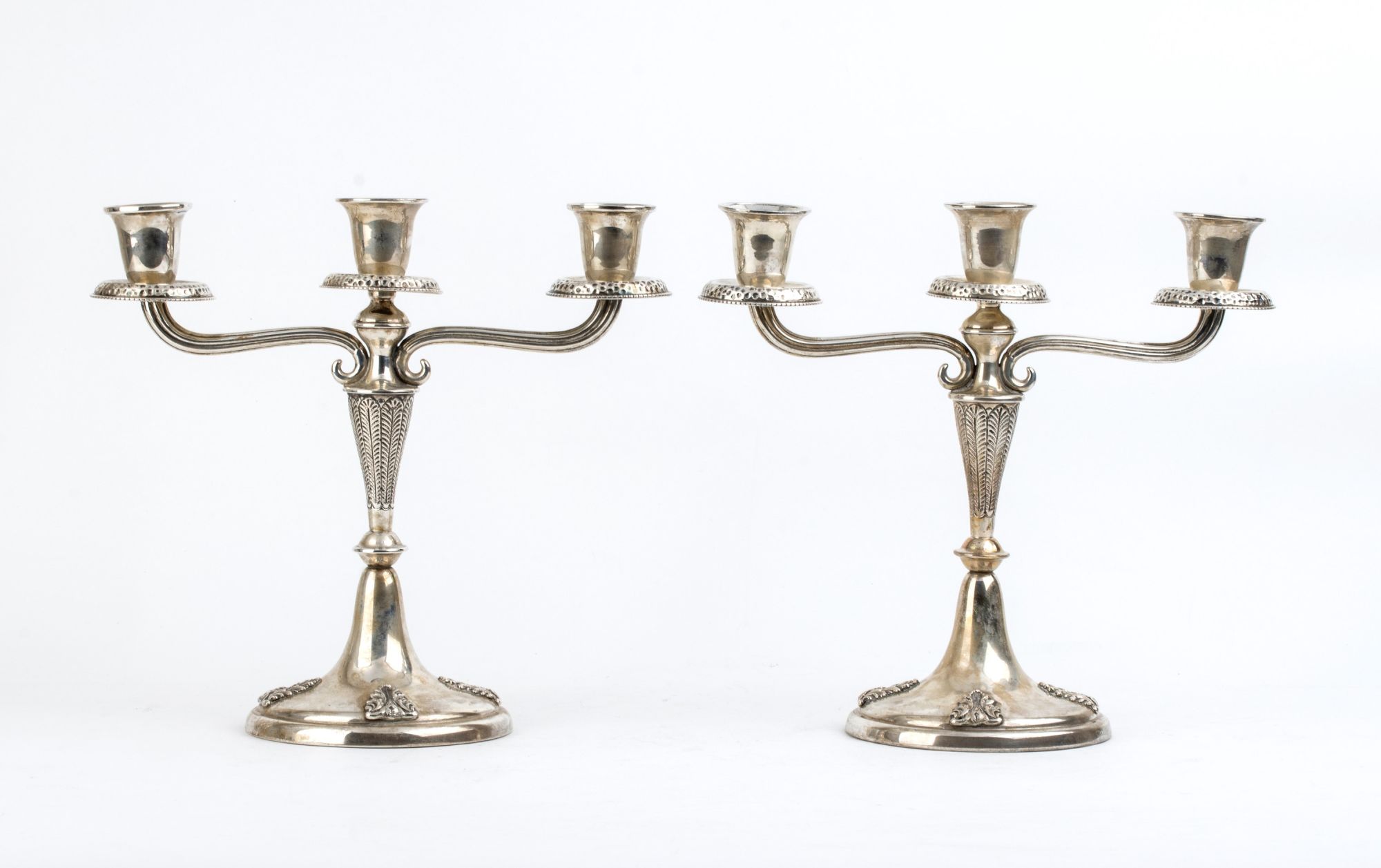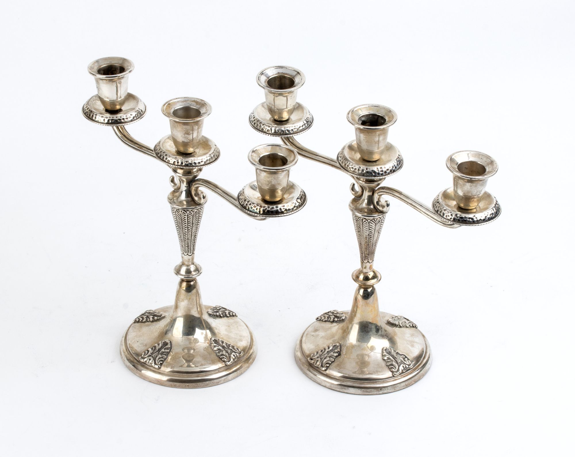 Coppia di candelabri in argento - Italia, anni '50, argentiere Mario Sorelli Altezza x Larghezza x Profondità: 24 x 25,5 x 12,5 cm. Peso complessivo lordo 889 gr.