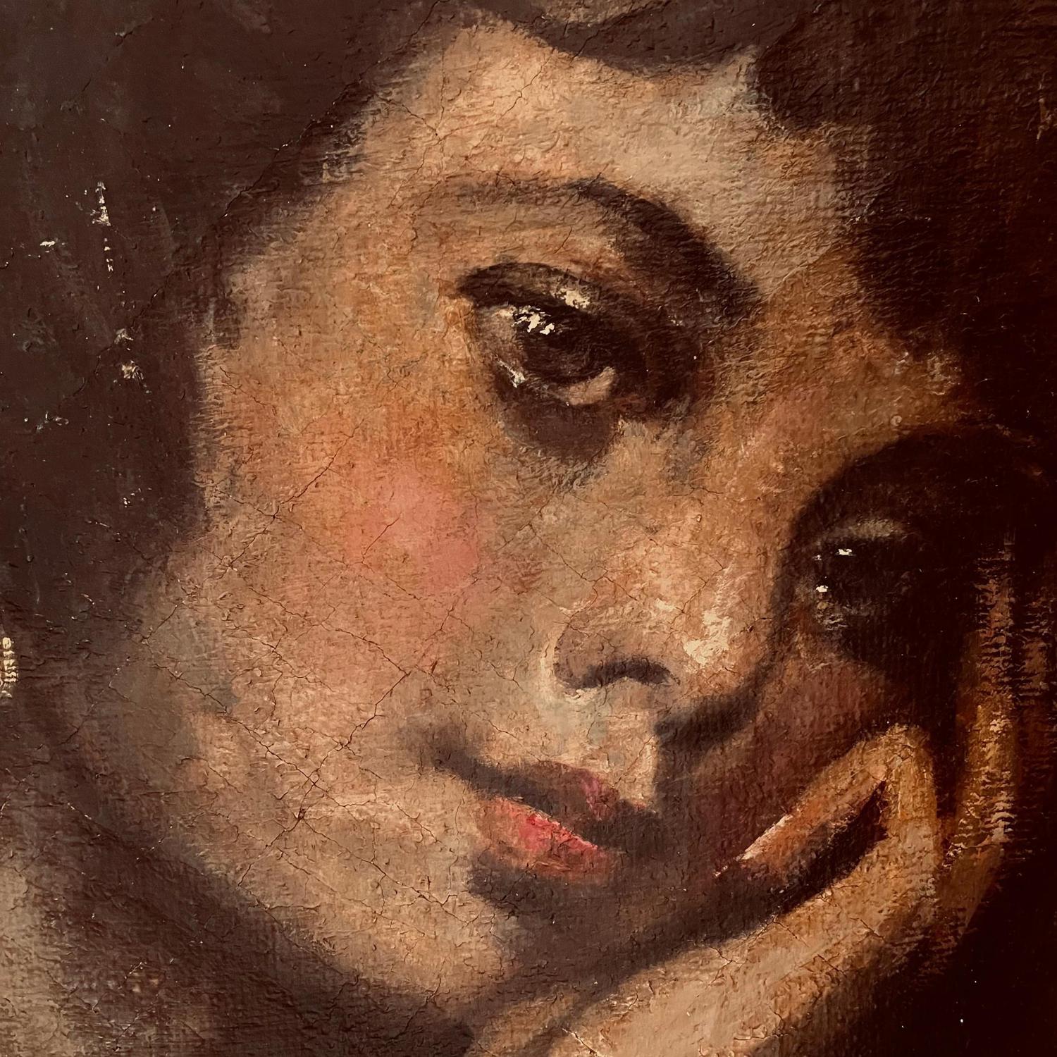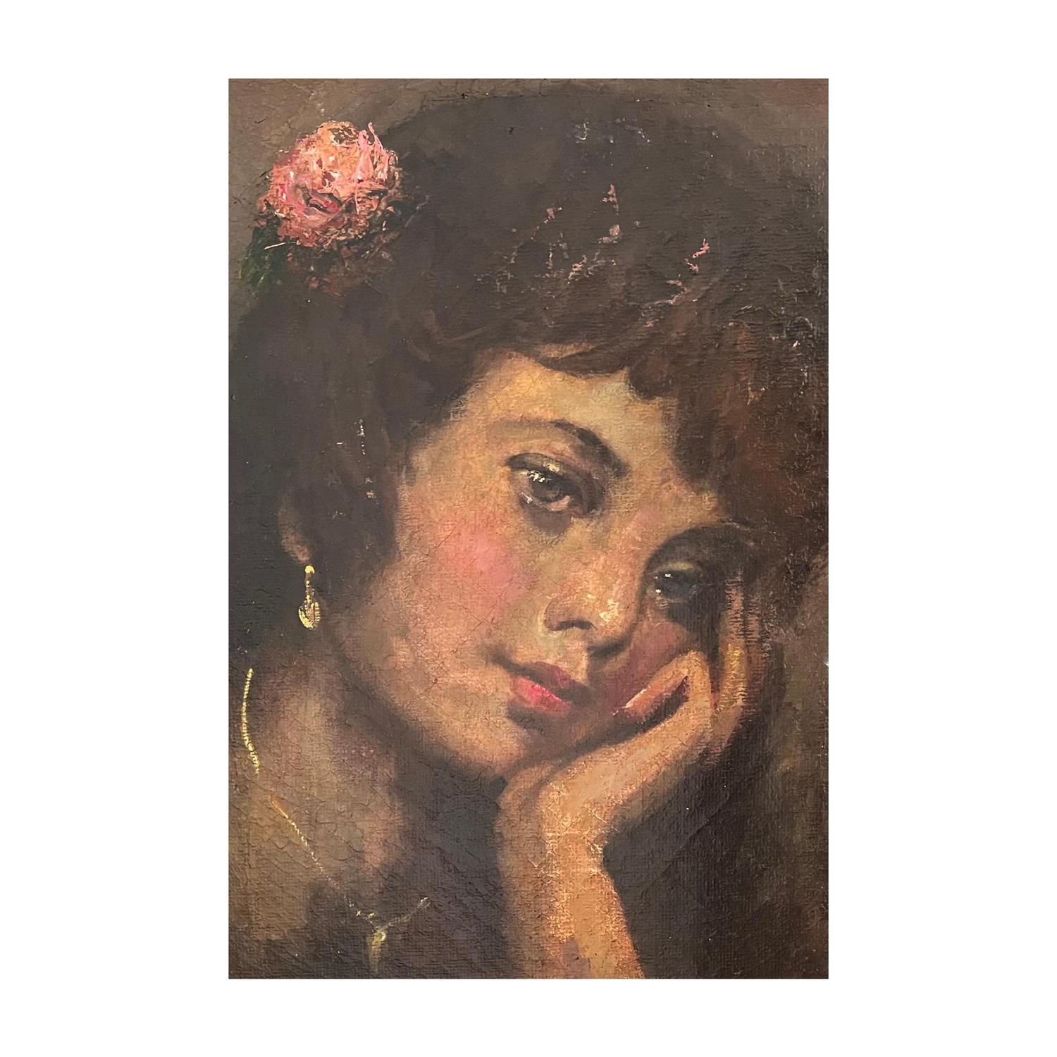Dipinto olio su tela attaccato su tavola, raffigurante Ritratto di donna. Copia da Giovanni Maria Mossa 1896-1982. XX secolo.