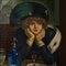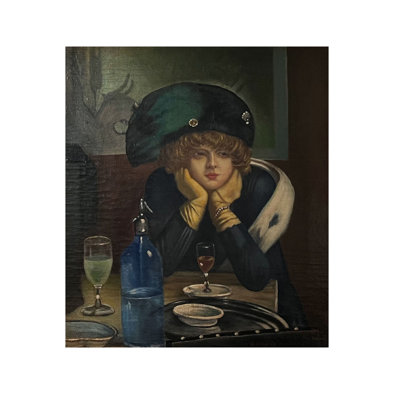 Dipinto olio su tela, scuola Francese raffigurante Ragazza al bistrot.