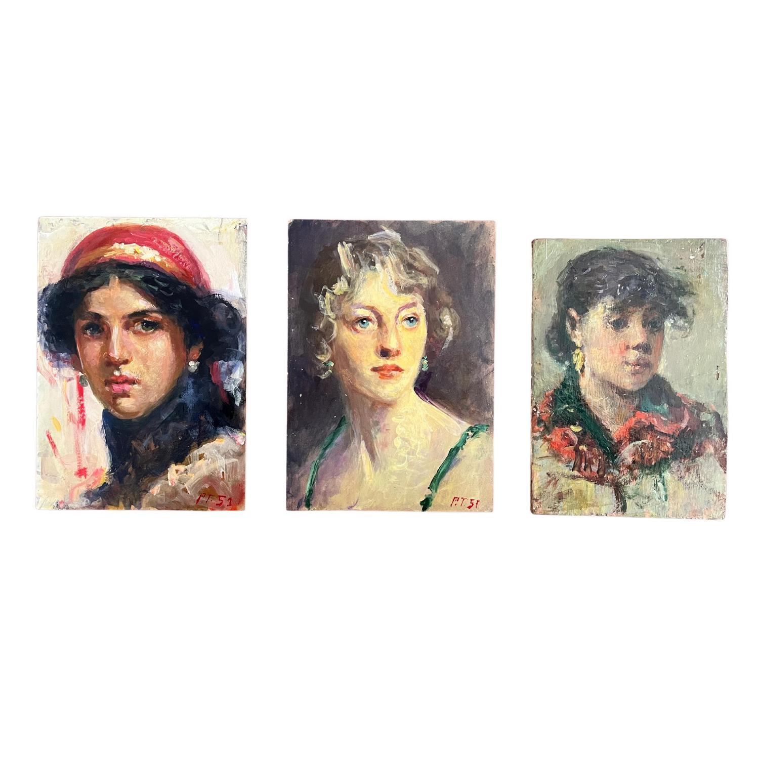 Lotto di tre piccoli dipinti olio su pannello, periodo XX secolo raffiguranti ritratti di donna.
