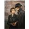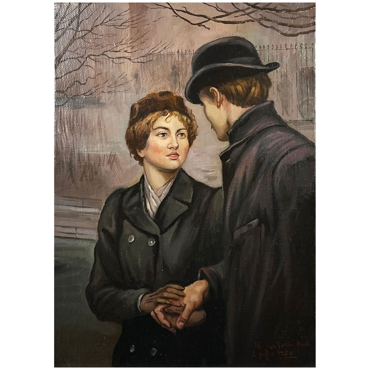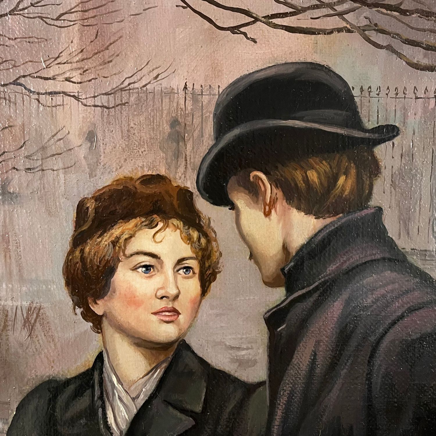 Dipinto olio su tela, periodo XX secolo raffigurante Giovane coppia nella maniera di Hugh Goldwin Rivière, artista britannico.