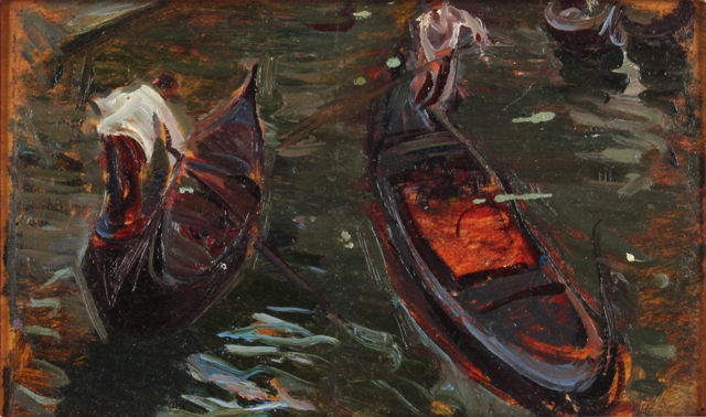Amedeo Momo Simonetti Roma 1874 – 1922 Barche in laguna olio su tavola cm 12 x 20 sul retro Inventario Simonetti n. 12