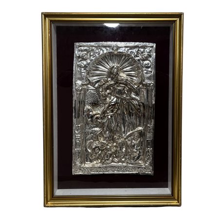 Lastra in metallo argentato lavorato a sbalzo raffigurante Vergine Maria e...