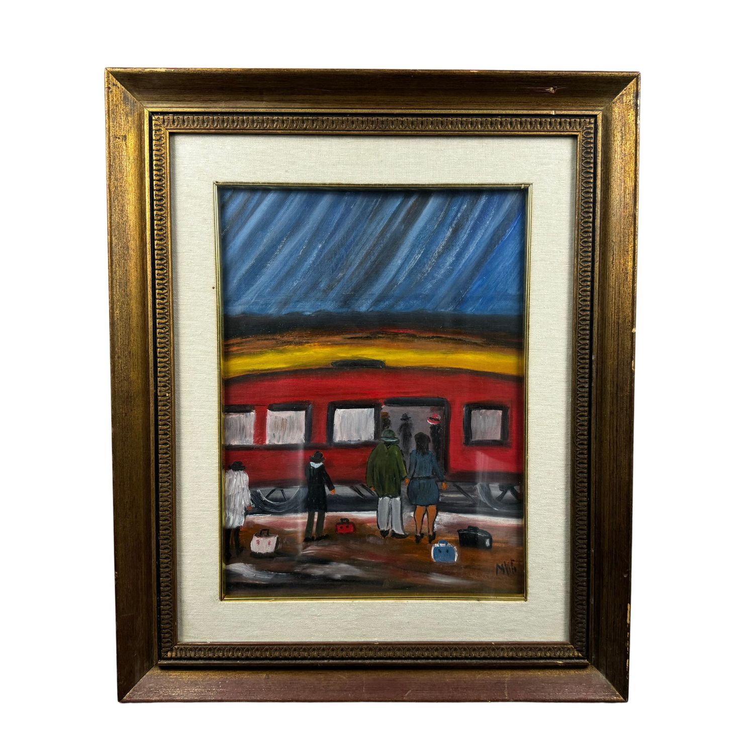 Dipinto olio su cartoncino, periodo XX secolo scuola Italiana, raffigurante L'attesa del treno.
