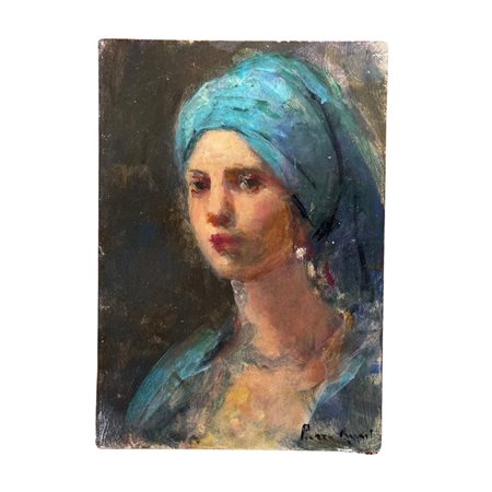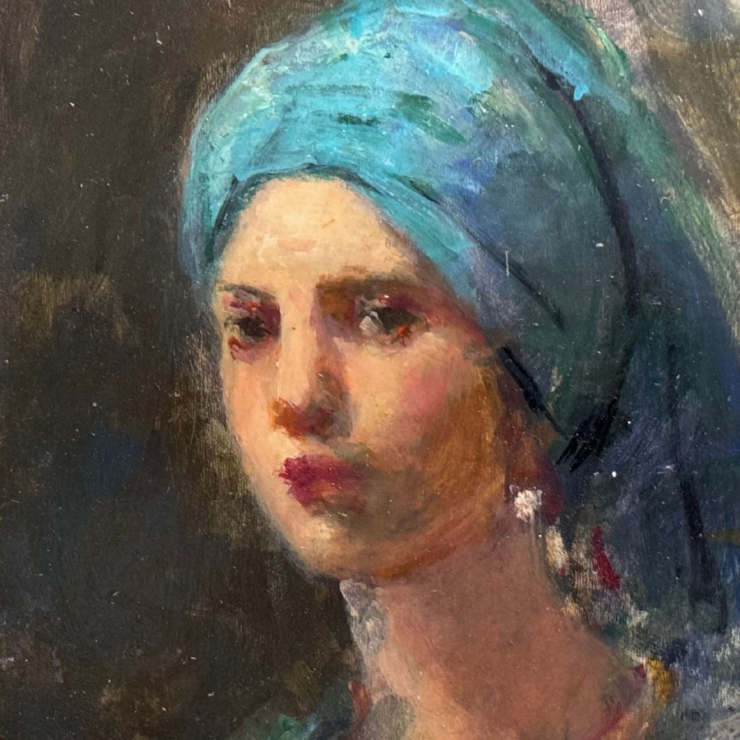 Piccolo dipinto olio su pannello, periodo XX secolo scuola Italiana, raffigurante Donna con turbante.