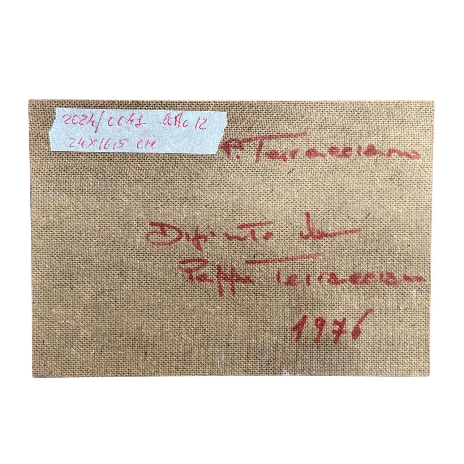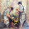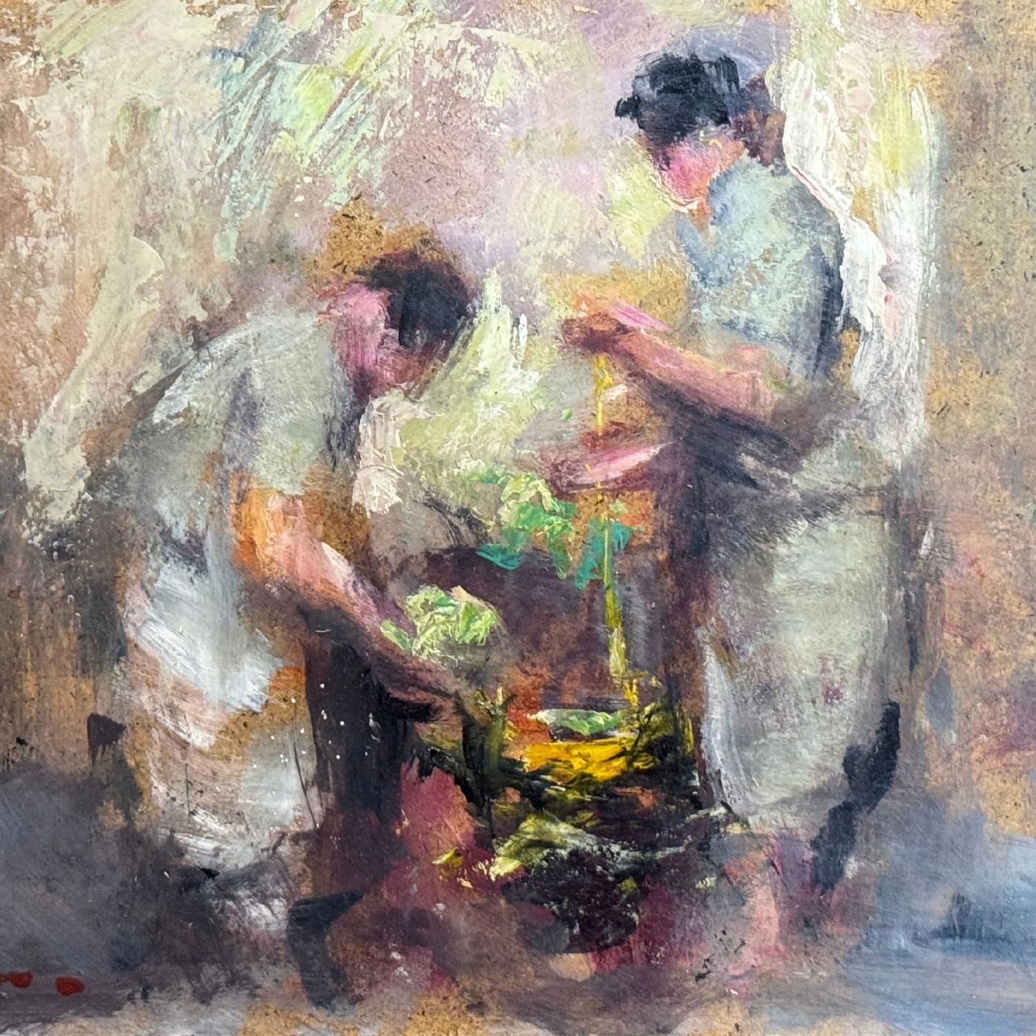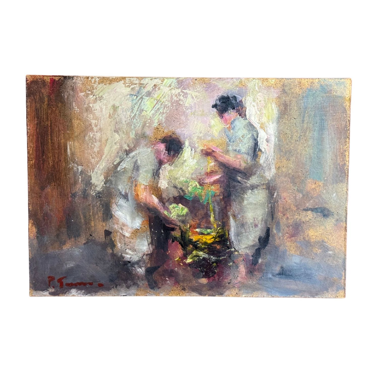 Piccolo dipinto olio su pannello, periodo XX secolo scuola Italiana, raffigurante Due personaggi.