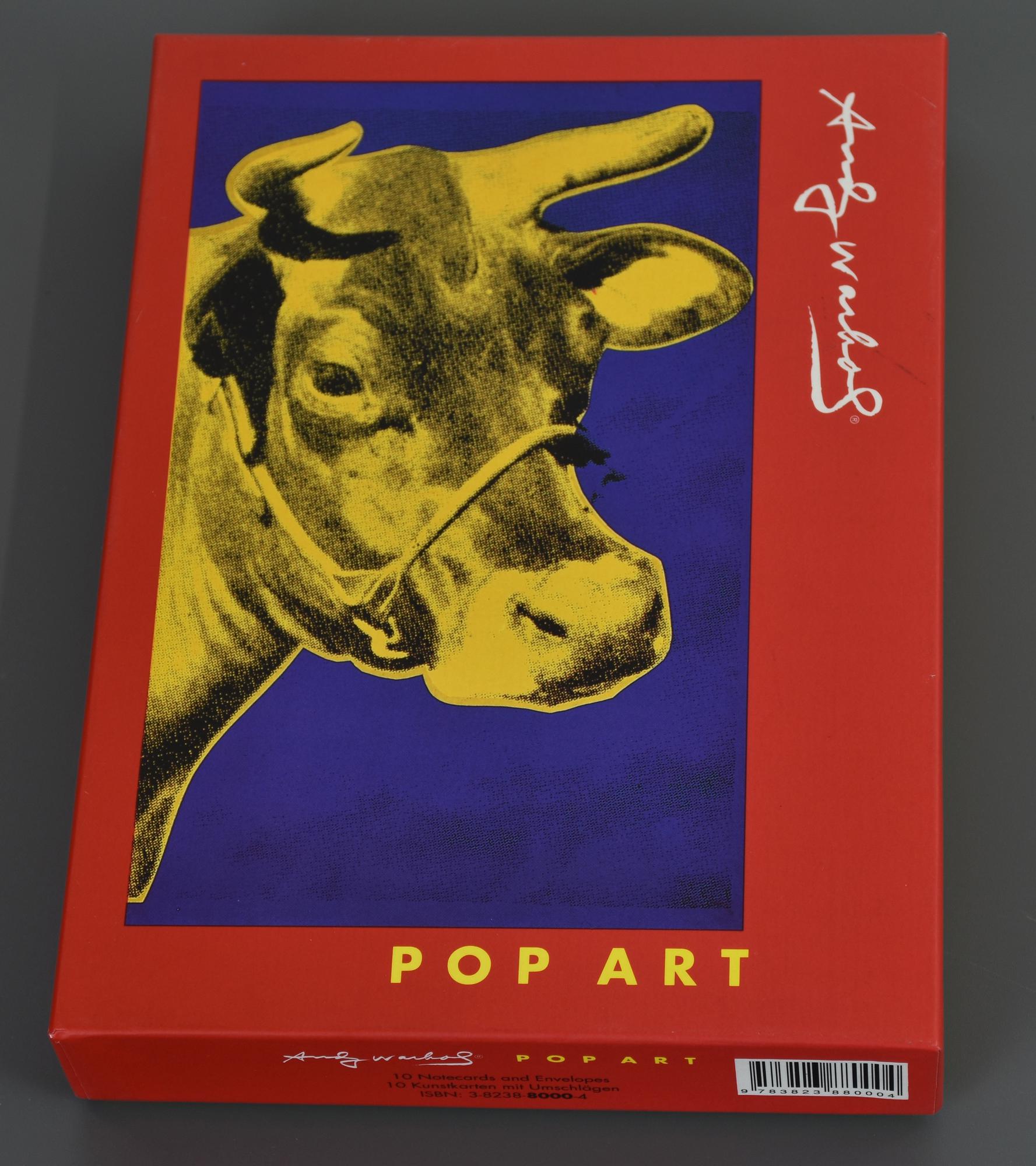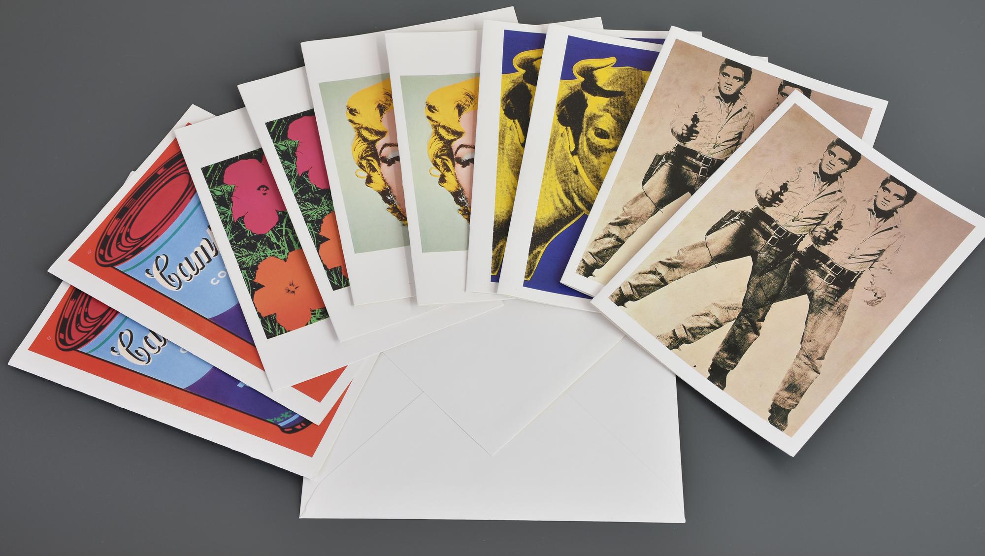 scatola contenente 10 cartoline raffiguranti soggetti iconici di Andy Warhol, con relative buste postali, cm 19,5x14,5
