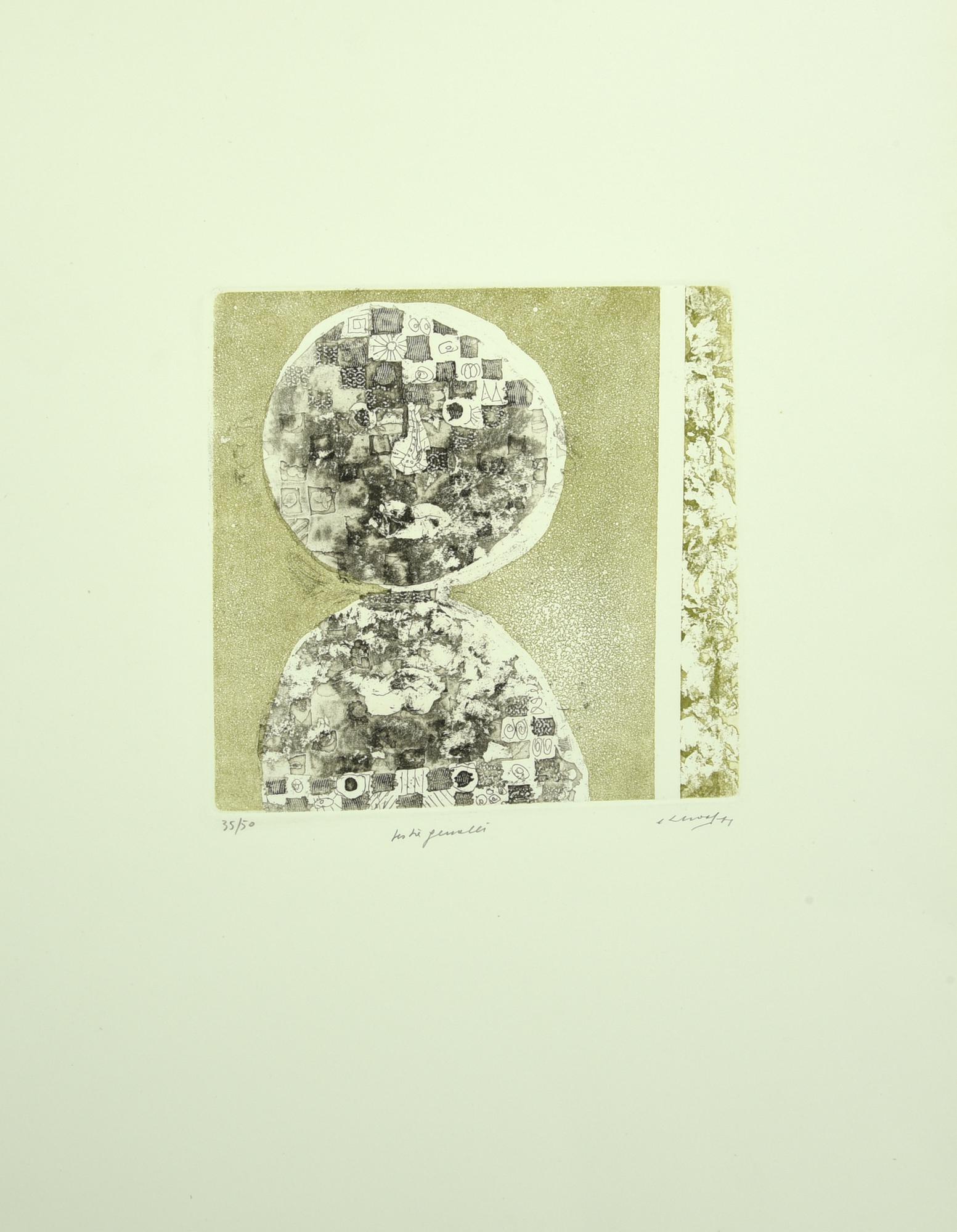 Acquaforte acquatinta a due colori, mm 254x245, su foglio cm 70x50; es. 35/50