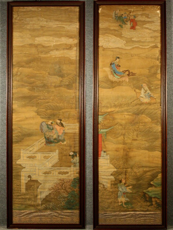 Coppia di pannelli tempera su carta raff. ''SCENE CON PERSONAGGI''. Cina. XIX secolo. In cornice. Difetti. Mis. Lung. cm. 61 Alt. cm. 220 ca.