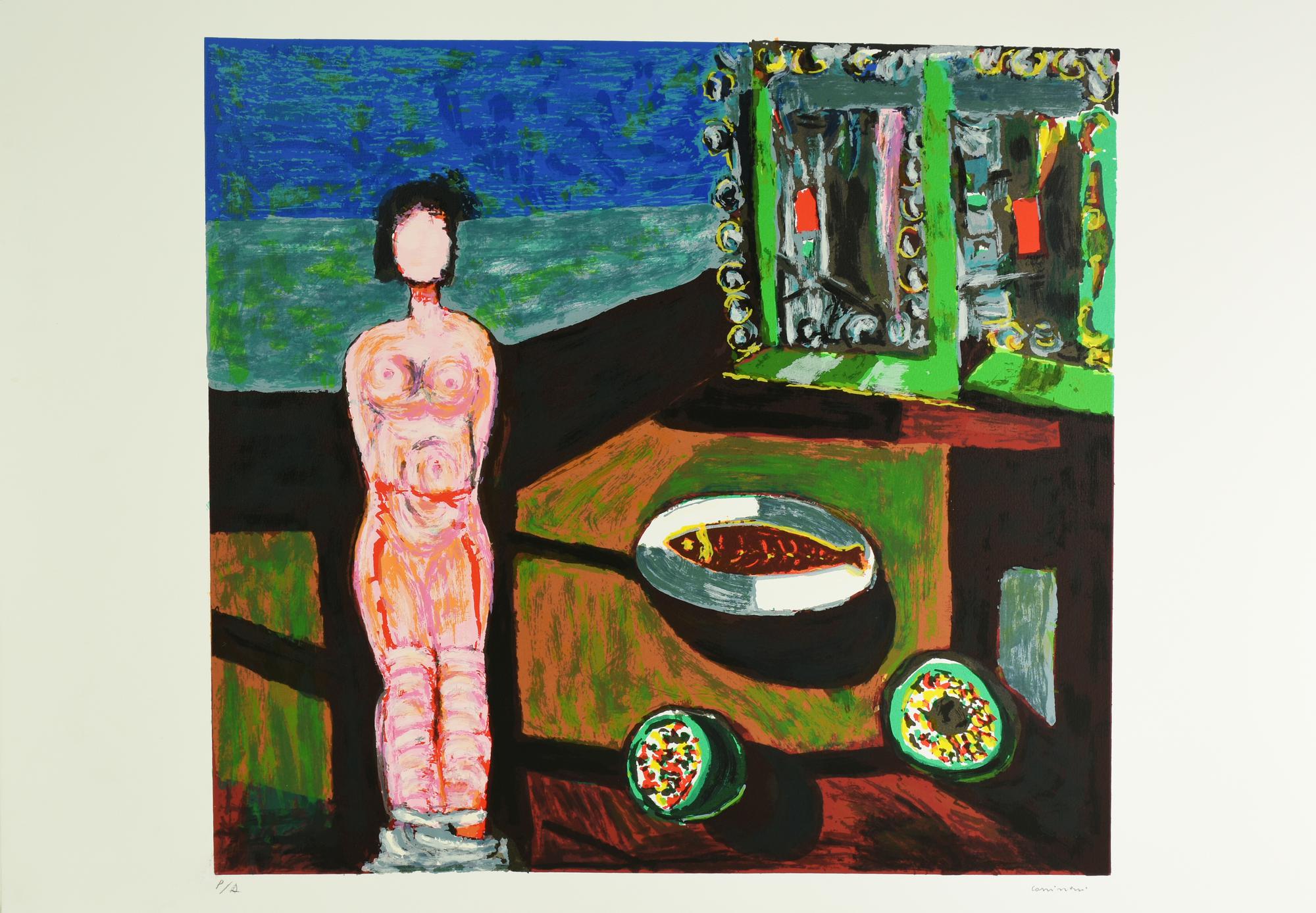 Bruno Cassinari NATURA MORTA CON NUDO serigrafia su carta Fabriano, cm 50x70;...