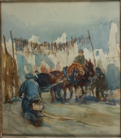 Giuseppe Carosi Roma 1883 – 1965 Motociclisti al fronte acquarello cm 41 x 36 firmato in basso a destra Bibliografia R. Mammucari, M. Berri, “ I XXV della campagna romana” ed. Vela, pag. 53