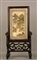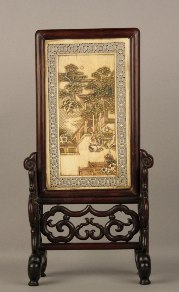 Placca in avorio finemente intagliato e traforato montata su base di legno traforato. Firmata sul retro. Cina. Fine XIX-inizi XX secolo. Mis. Lung. cm. 17 Alt. cm. 33 ca.