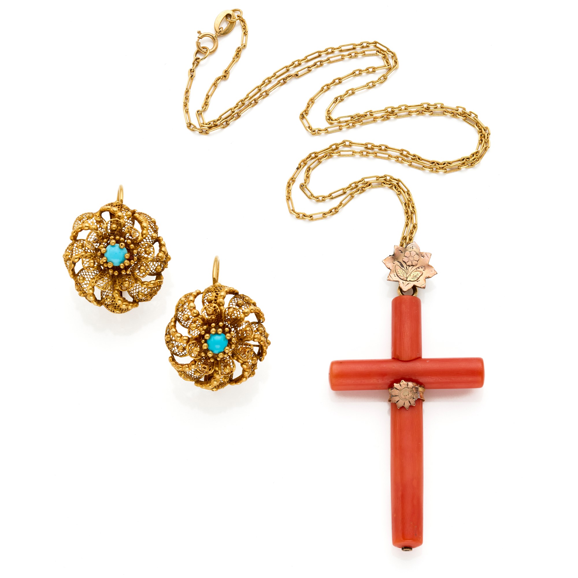 Lotto composto da orecchini in oro giallo 18 Kt con paste di turchese e catenina in metallo con croce in corallo