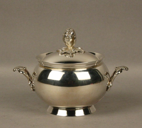 Zuccheriera in argento con coperchio sormontato da una pigna, gr. 250 ca. XX secolo. Mis. Lung. cm. 15 Alt. cm. 10 Prof. cm. 10 ca.