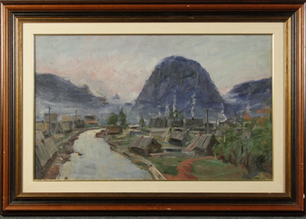ZUK VLADIMIR KLIMENT'EVIC - Nato in Bielorussia nel 1932. Ha vissuto a Mosca. Morto nel 2003. Le sue opere sono esposte nei musei di tutto il mondo. Dipinto olio su cartone raff. ''VILLAGGIO DI MINATORI''. Firmato in basso a destra. In cornice. Mis. Lung. cm. 60 Alt. cm. 50 ca.